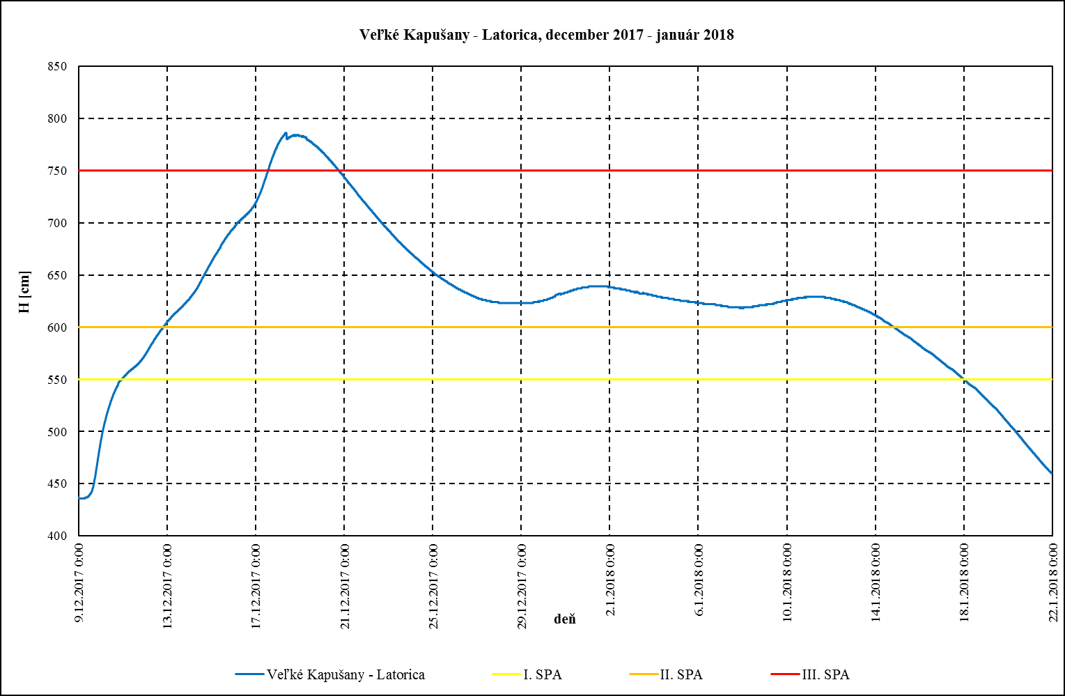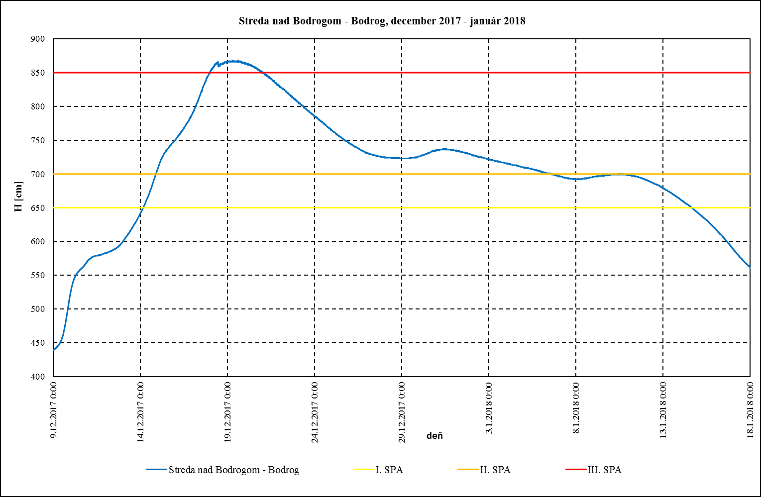 Tretí stupeň povodňovej aktivity na Latorici sa udržal 4 dni a kulminoval pri vodnom stave 784 cm, avšak historické maximum nebolo prekročené. Kulminačný prietok zodpovedal hodnote 5 až 10 ročnej vody, na ostatných tokoch väčšinou hodnote 1 až 2 ročnej vody. Zvyšok mesiaca december ešte pretrvávali vysoké vodné stavy na Latorici a Bodrogu na úrovni II. SPA a mierne klesali až do skončenia povodňovej situácie v druhej dekáde januára 2018. Táto situácia bola spôsobená dlhodobo trvajúcimi vysokými vodnými stavmi na ukrajinskej časti povodia Latorice.