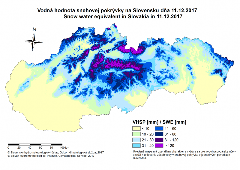 Obr. 1: Vodná hodnota snehovej pokrývky na Slovensku dňa 11.12.2017.