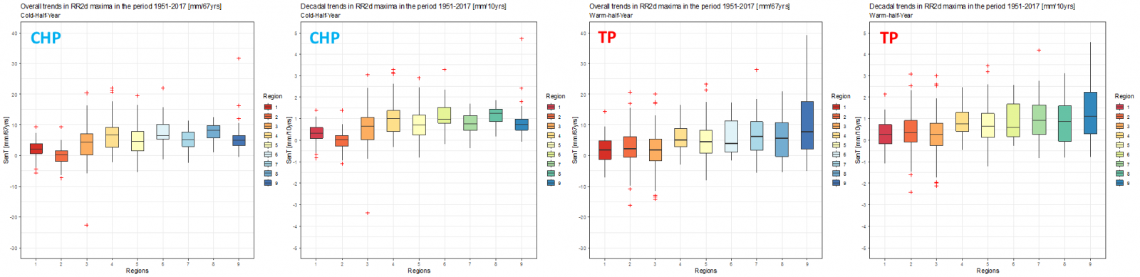 V rámci štatistickej analýzy sme sa zamerali na hodnotenie dlhodobej variability a zmien vybraných ročných, sezónnych a mesačných charakteristík RR2d, tak na jednotlivých staniach (418) ako aj vo vybraných regiónoch (1 - Podunajská nížina; 2 - Záhorie, stredné Považie a Ponitrie; 3 - horné Považie, Turiec, Orava a Kysuce, Liptov; 4 - stredné Pohronie; 5 - Juhoslovenská kotlina; 6 - Horehronie, sev. časť Gemera; 7 - Spiš, Šariš, časť Liptova; 8 - Východoslovenská nížina, juh Košickej kotliny; 9 - Východné Beskydy, Vihorlat, severovýchodná časť Tatier). Výsledky bodového – staničného – spracovania trendov, pomocou metódy Kendallovho Theil-Sen (trendu), a parametrického odhadu n-ročných hodnôt maxím RR2d (s využitím parametrického GEV rozdelenia, regionálne hodnotenie zmeny n-ročnosti pre 50 a 100 ročnú hodnotu RR2d) pred chladný a teplý polrok sú uvedené na Obr. 5 a 7. Regionálne hodnotenie výskytu nadprahových maxím RR2d pre deväť regionálnych celkov je uvedené v obrázku v prílohe, regionálne štatisticky priemerných dekádnych a celkových trendov RR2D sú zobrazené v Obr. 6. Časové rozloženie hustoty pravdepodobnosti výskytu nadprahových hodnôt RR2D ako aj jej zmeny v rámci deviatich regiónov a sezón je znázornené v Obr. 8, 9 a 10 (jar, leto, jeseň a zima).