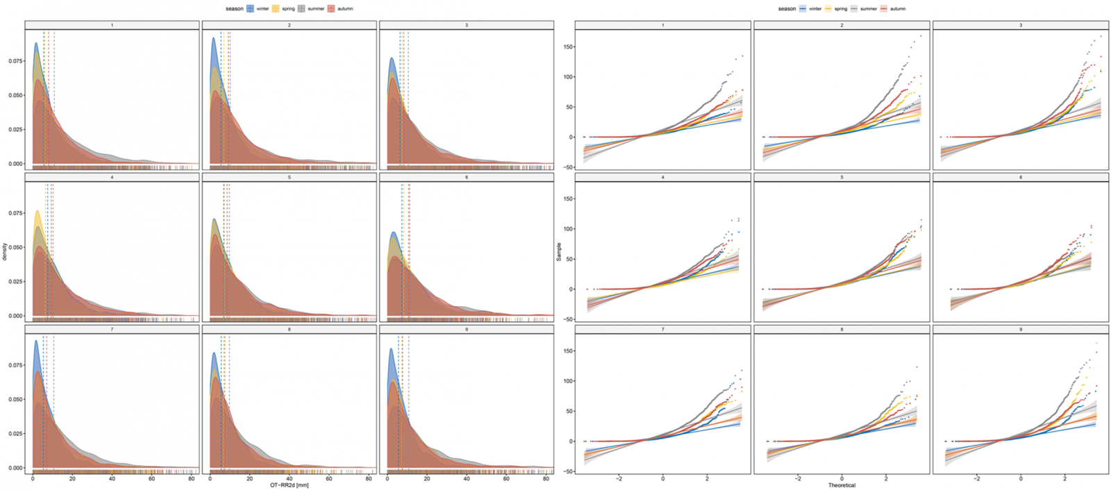 Obr. 8: Hustota pravdepodobnosti výskytu nadprahových maxím RR2d (nad 75. percentilom rozdelenia, vľavo) a rozdelenie teoretických a pozorovaných kvantilov RR2d (Q-Q graf) v jednotlivých regiónoch Slovenska (1-9) a pre sezóny – jar (spring - žltá), leto (summer - sivá), jeseň (autumn - tehlová červená) a zima (winter - modrá) v rámci obdobia 1951-2017; vertikálne čiary na obrázku vľavo označujú pozíciu mediánu daného rozdelenia - významne vyššie hodnoty RR2d sa vyskytujú predovšetkým na jar a v lete, v priestore južného Slovenska aj na jeseň [Zdroj: SHMÚ; zväčšenie obrázku]