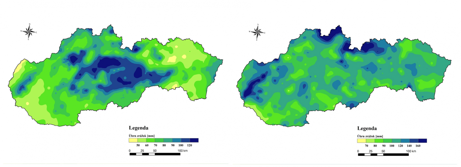 Obr. 4: Maximálne sumy RR2d zrážok na území Slovenska v chladnom (vľavo) a teplom (vpravo) polroku v období 1951-2010 [Zdroj: Markovič 2017; zväčšenie obrázku]