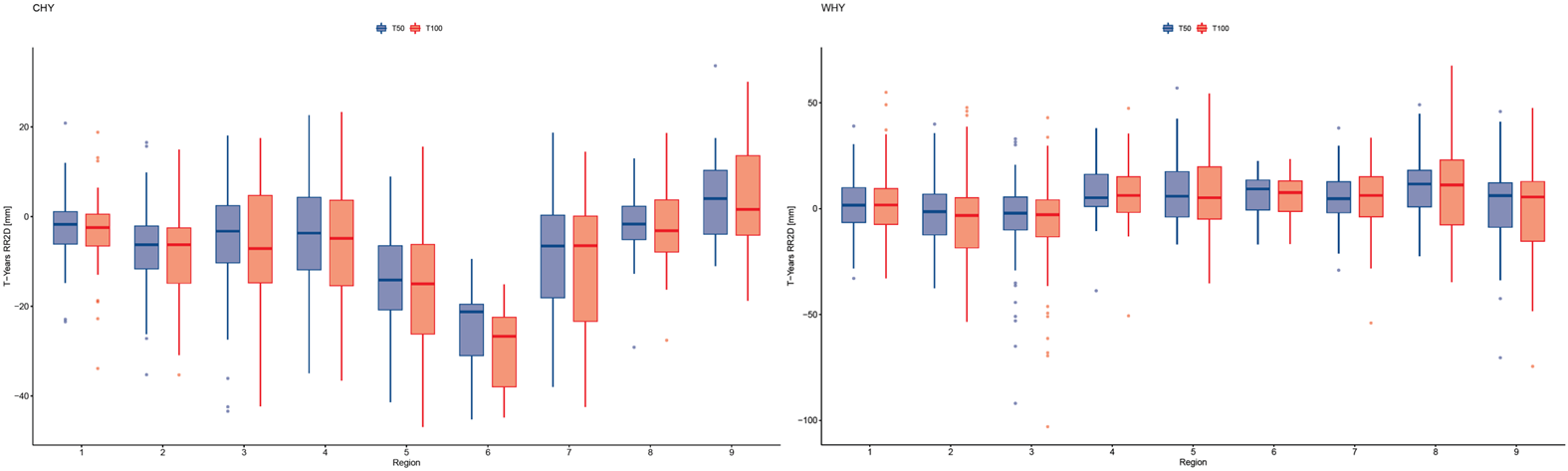 Obr. 7: Zmeny odhadovaných hodnôt (mm) maxím 2-denného úhrnu zrážok s pravdepodobnosťou opakovania 1-krát za 50 (modré) a za 100 rokov (červené) pre chladný (vľavo) a teplý (vpravo) polrok v jednotlivých regiónoch na Slovensku v porovnávacích obdobia 1951-1990 a 1981-2017 - analýza poukazuje na významný pokles 50 a 100-ročných hodnôt RR2d v niektorých regiónoch v priebehu chladného polroka (regióny 5 a 6) a na zväčša štatisticky nevýznamné zmeny - prevažne nárast - RR2d v priebehu letného polroka [Zdroj: SHMÚ; zväčšenie obrázku]
