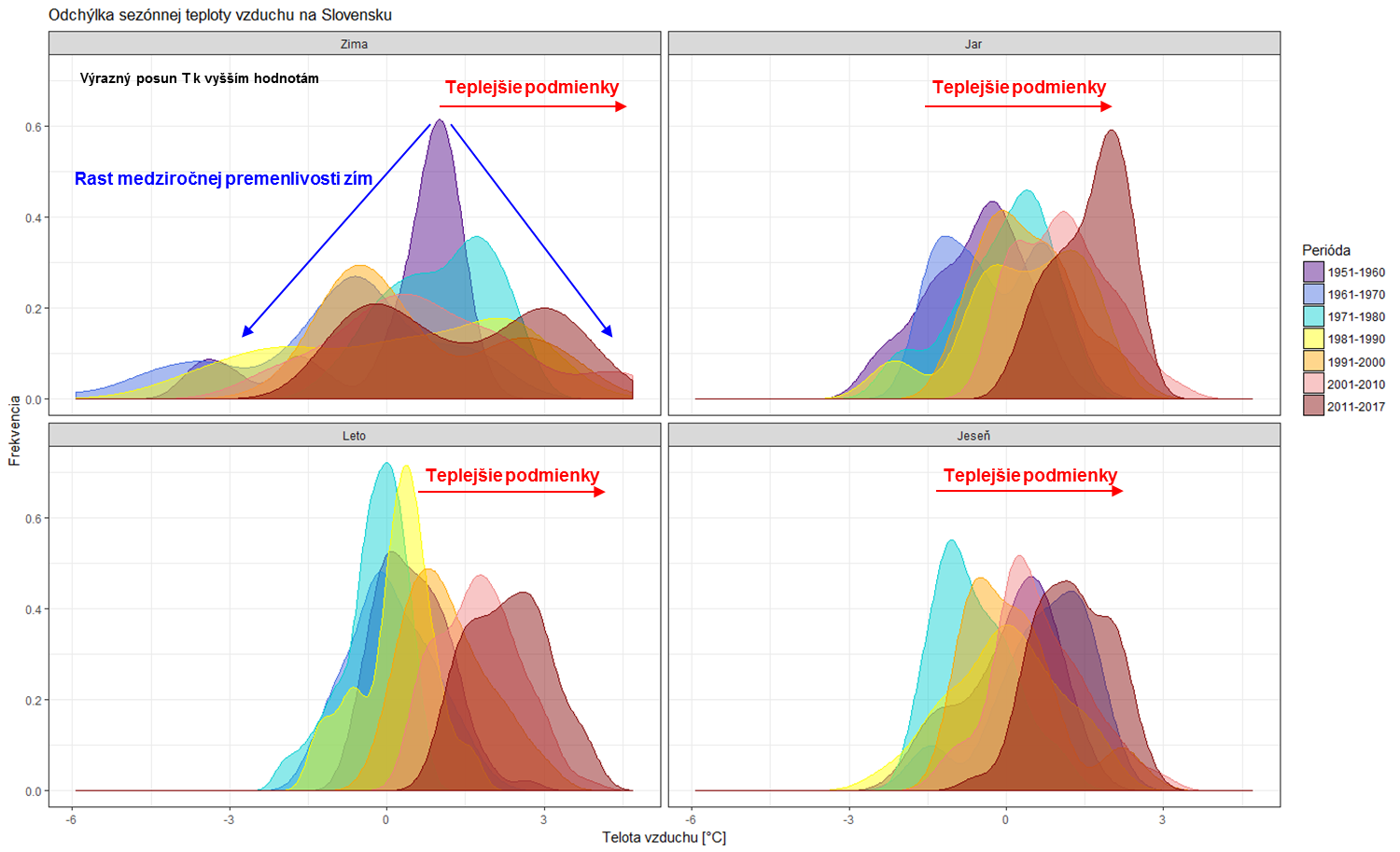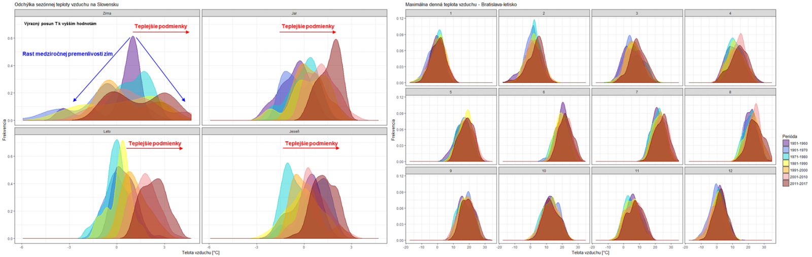 Zmena klímy vedie k významnému rastu teploty vzduchu v celej kontinentálnej časti Európy, vrátane Slovenska. Zatiaľ čo v Európe za posledných približne 138 rokov vzrástla priemerná ročná teploty vzduchu o približne 1,5 °C (tempo rastu 0,25-0,30 °C/desaťročie od roku 1961), na Slovensku to bolo v priemere o až 1,7 – 1,8 °C, pričom najvýraznejšie sa rast teploty prejavuje v letných mesiacoch, kedy sa priemerná teplota vzduchu zvýšila aj o viac ako 2,0 °C (zmenu distribúcie odchýlok teploty vzduchu v jednotlivých ročných sezónach a mesiacoch na Slovensku a pre Bratislavu je možné vidieť na Obr. 1 – výrazný je najmä posun priemernej sezónnej teploty vzduchu na jar a v lete v prospech vyšších hodnôt medzi rokmi 1951-2017; Obr. 2 - vývoj odchýlky teploty vzduchu za teplý polrok a leto v období 1951-2018).