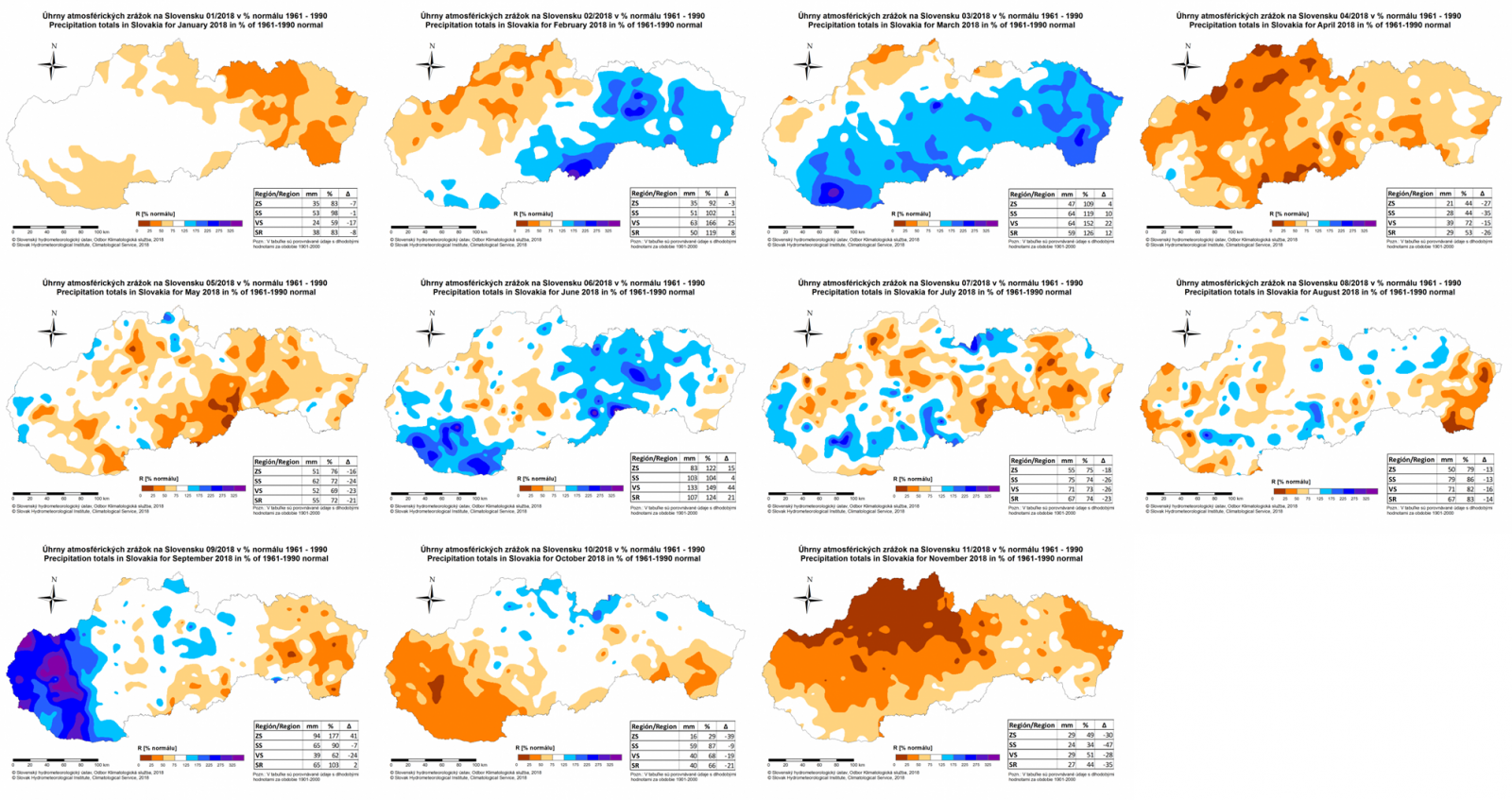Je veľmi pravdepodobné, že práve zvyšovanie teploty vody povrchových vrstiev severného Atlantického oceánu a Severného ľadového oceánu vedie bezprostredne nielen k zvyšovaniu priemerného množstva vodnej pary v prízemných vrstvách atmosféry, ale ovplyvňuje aj dynamiku atmosférického prúdenia a následne aj proces genézy, vertikálnu a horizontálnu mohutnosť, stabilitu i dráhy postupu tlakových útvarov. Takto podmienená zmena cirkulácie atmosféry, v kombinácii s dlhodobým trendom rastu teploty vzduchu, môže mať aj v podmienkach Slovenska za následok zmenu distribúcie zrážok v priebehu roka (a prejavilo sa to aj v roku 2018 - obrázok ilustruje distribúciu množstva atmosférických zrážok v mesiaoch január - november 2018), nárast podielu búrkových lejakov na celkovom sezónnom a ročnom úhrne zrážok a narastajúcu extremalitu prejavov zrážkovej činnosti (a to aj v prípade RR2d).