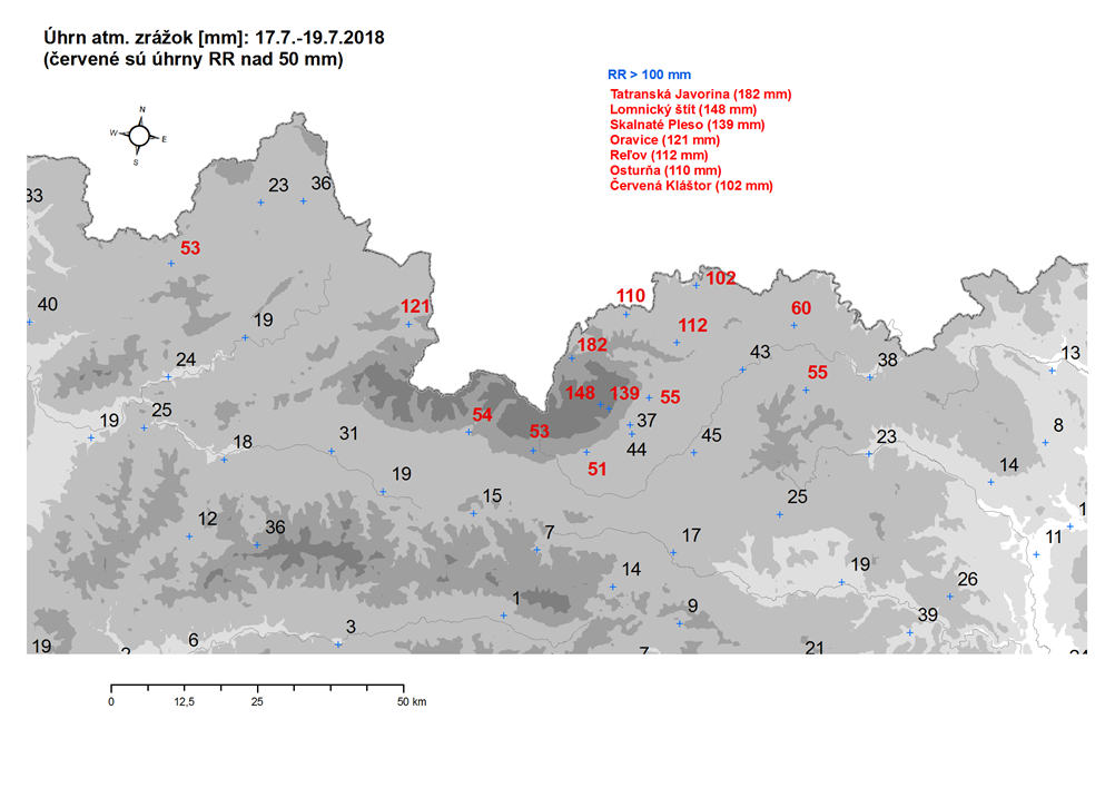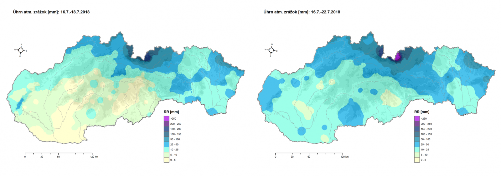 Aj v priebehu tohto roka (2018) sme na Slovensku zaznamenali minimálne dve situácie, kedy sme v sieti meteorologických staníc SHMÚ zaznamenali vysoké 2-denné sumy atmoférických zrážok, a to v druhej polovici júla (17.-18.7.2018; Obr. 3), kedy napríklad v Tatranskej Javorine spadlo za 48 hodín 167,0 mm a Podspádoch 164,4 mm zrážok; a na začiatku septembra (1.-2.9.2018; podrobná analýza je k dispozícii na stránke SHMÚ).