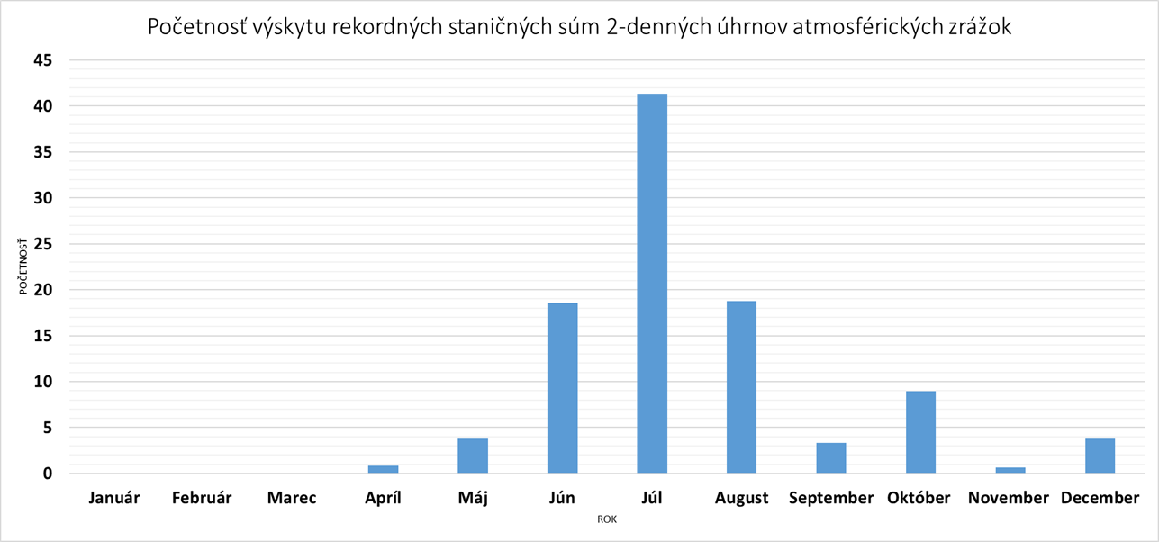 Absolútne najvyššia hodnota maximálnej sumy RR2d zrážok na Slovensku v rámci obdobia 1951 – 2017 predstavovala 227,1 mm, a bola nameraná v júli 1970 na zrážkomernej stanici Rabča. Hodnoty RR2d nad 200 milimetrov boli na našom území namerané len počas mesiacov jún a júl a z hľadiska výskytu ich môžeme na území Slovenska považovať za veľmi ojedinelé, keďže evidujeme len 11 takýchto prípadoch nameraných na siedmich zrážkomerných staniciach: Rabča, Oravská Polhora – Hlina, Tatranská Javorina, Novoť, Zuberec – Zverovka, Skalnaté Pleso a Borinka. Ďalej môžeme konštatovať, že suma RR2d väčšia ako 100 mm bola zaznamenaná aspoň raz na 306 staniciach, čo predstavuje 63 % staníc celého výberového súboru. Relatívne najčastejšie sa najvyššie (rekordne vysoké) RR2d vyskytujú na Slovensku v letných mesiacoch, predovšetkým v júli (41 %), pričom v teplom polroku je výskyt maximálnych hodnôt sústredený predovšetkýcm do oblasti Tatier, Oravských, Kysuckých Beskýd a Malých Karpát (Obr. 4).
