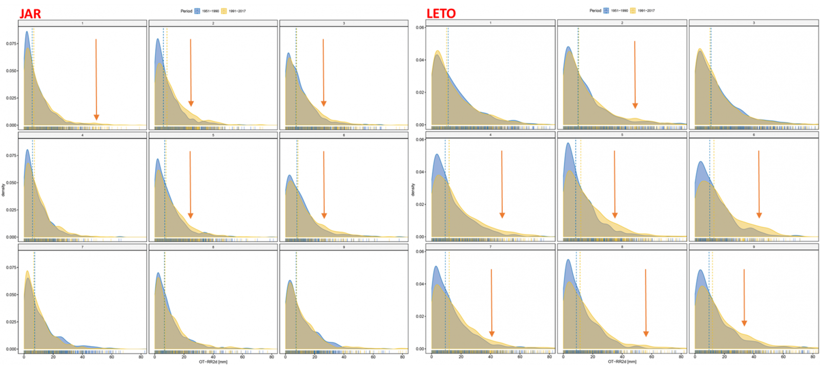Obr. 9: Zmena hustoty pravdepodobnosti (pozorovanej distribúcie) nadprahových RR2d hodnôt v jednotlivých regiónoch pre jar a leto pri porovnaní dvoch období (1951-1990 - modrá a 1991-2017 - žltá); šípky ukazujú na oblasti s významnými zmenami; vertikálne čiary na obrázku označujú pozíciu mediánu daného rozdelenia - nárastom frekvencie výskytu výšších hodnôt RR2d v štatistickom súbore [Zdroj: SHMÚ; zväčšenie obrázku]