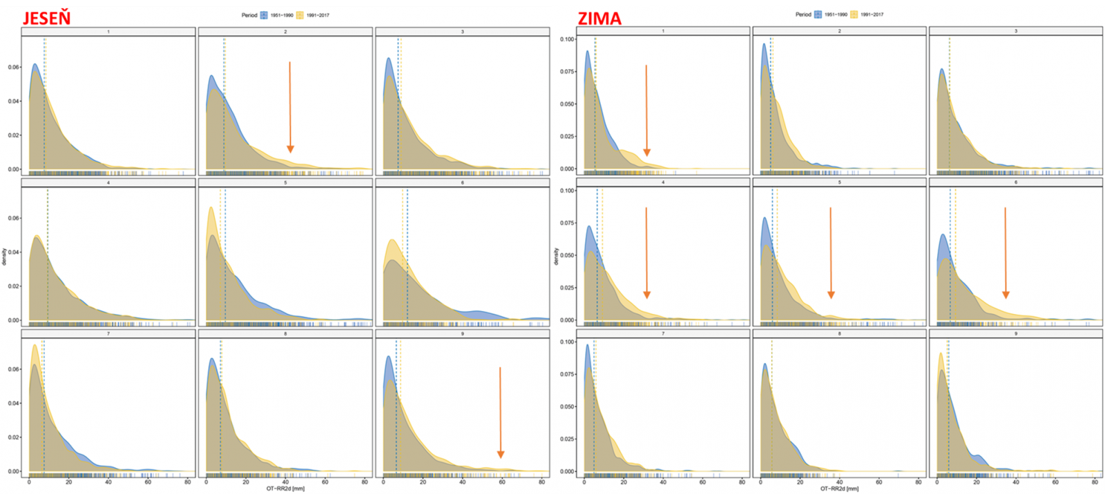 Obr. 10: Zmena hustoty pravdepodobnosti (pozorovanej distribúcie) nadprahových RR2d hodnôt v jednotlivých regiónoch pre jeseň a zimu pri porovnaní dvoch období (1951-1990 - modrá a 1991-2017 - žltá); šípky ukazujú na oblasti s významnými zmenami; vertikálne čiary na obrázku označujú pozíciu mediánu daného rozdelenia - nárastom frekvencie výskytu výšších hodnôt RR2d v štatistickom súbore [Zdroj: SHMÚ; zväčšenie obrázku]