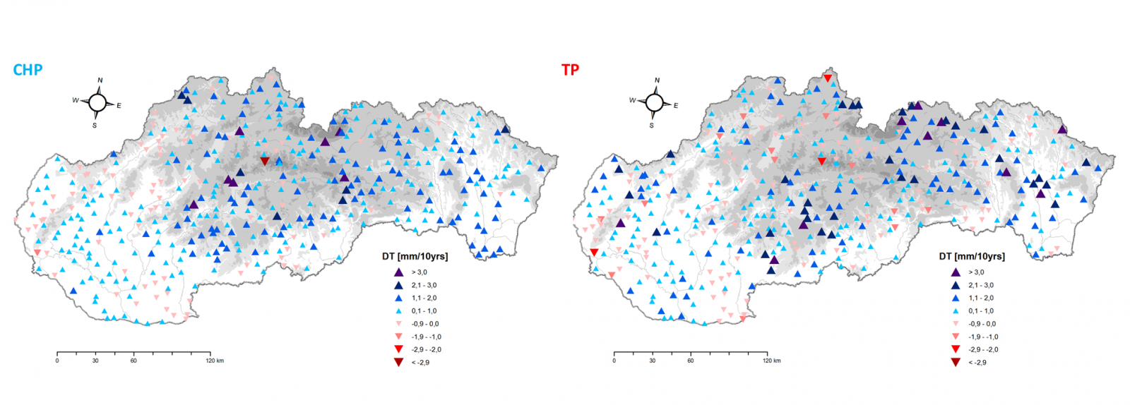 Výsledky naznačujú štatisticky významné, zväčša pozitívne trendy vybraných charakteristík RR2d - predovšetkým maximálnych hodnôt RR2d (Obr. 5) - predovšetkým v období teplého polroka (apríl – september), pričom však v priestorovom rozložení uvedených zmien existujú významné regionálne rozdiely (najmä zmeny RR2d a ich návrhových hodnôt, ako aj výskytu nadprahových hodnôt RR2d v priestore stredného a východného Slovenska v teplom polroku, pravdepodobne spôsobený vyššou frekvenciou letných búrkových lejakov v podmienkach kontinentálnejšej klímy).