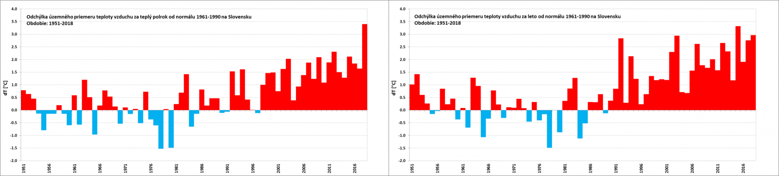 Obr. 2: Odchýlka územného priemeru teploty vzduchu za teplý polrok (vľavo) a leto (vpravo) od normálu 1961-1990 na Slovensku v období 1951-2018 [Zdroj: SHMÚ; zväčšenie obrázku]
