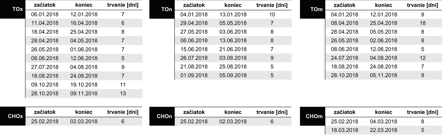 - TO/CHO boli identifikované podľa maximálnej (ozn.: TOx/CHOx), minimálnej (TOn/CHOn), aj priemernej (TOm/CHOm) dennej teploty vzduchu.