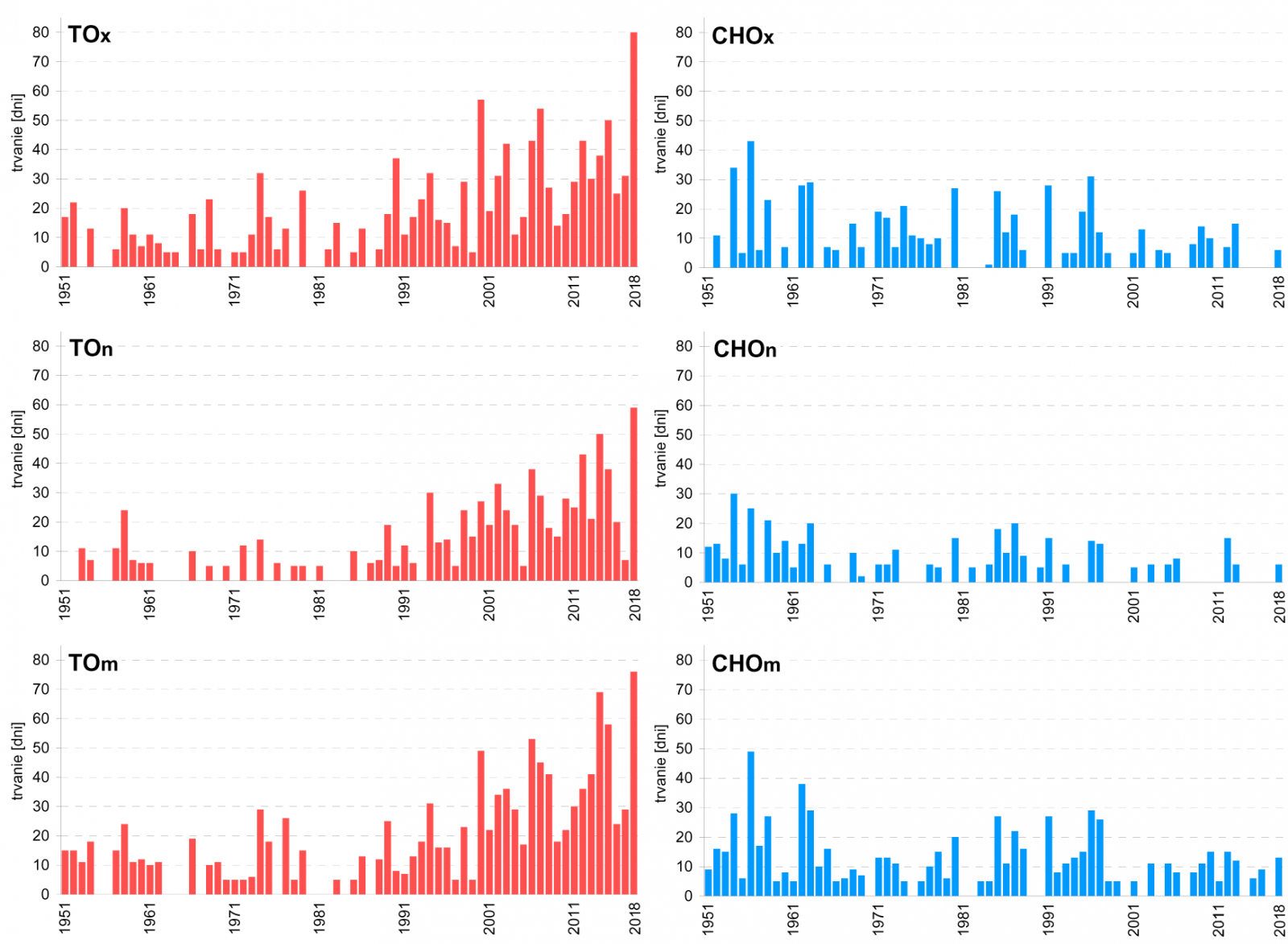 - v roku 2018 dosiahlo sumárne ročné trvanie TOx na Slovensku 80 dní. Doterajší rekord celoročného trvania TOx minimálne od r. 1951 bol 57 dní z r. 2000 (Obr. 2).