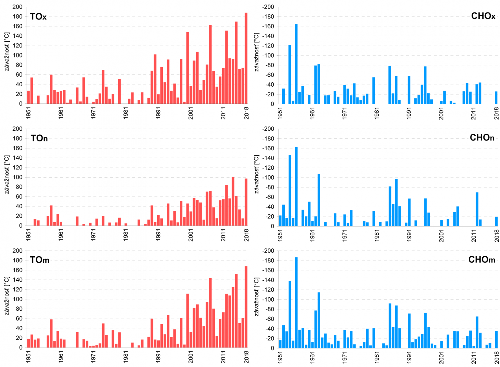 - v roku 2018 dosiahla sumárna ročná závažnosť TOx na Slovensku 187,8 °C. Doterajší rekord celoročnej závažnosti TOx minimálne od r. 1951 bol 169,7 °C z r. 2015 (Obr. 3).