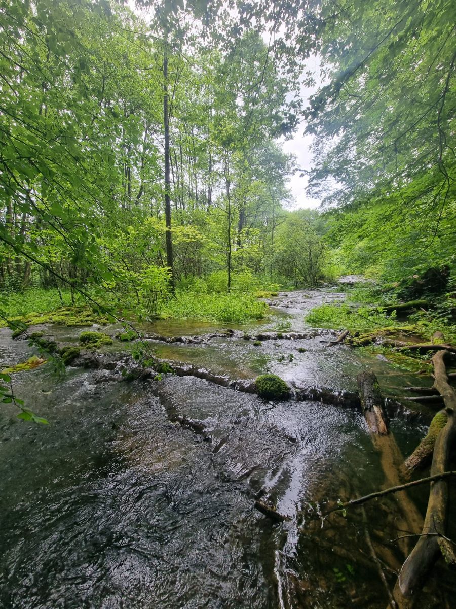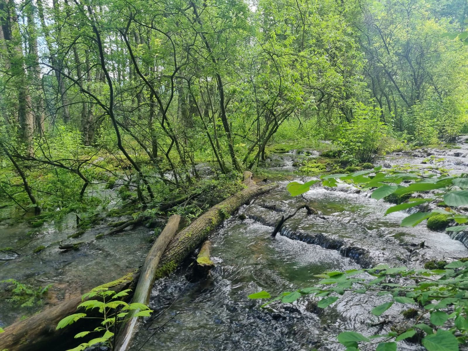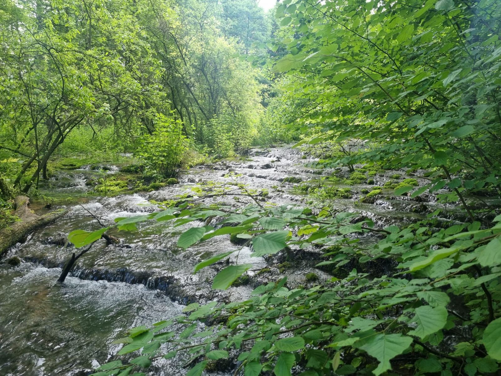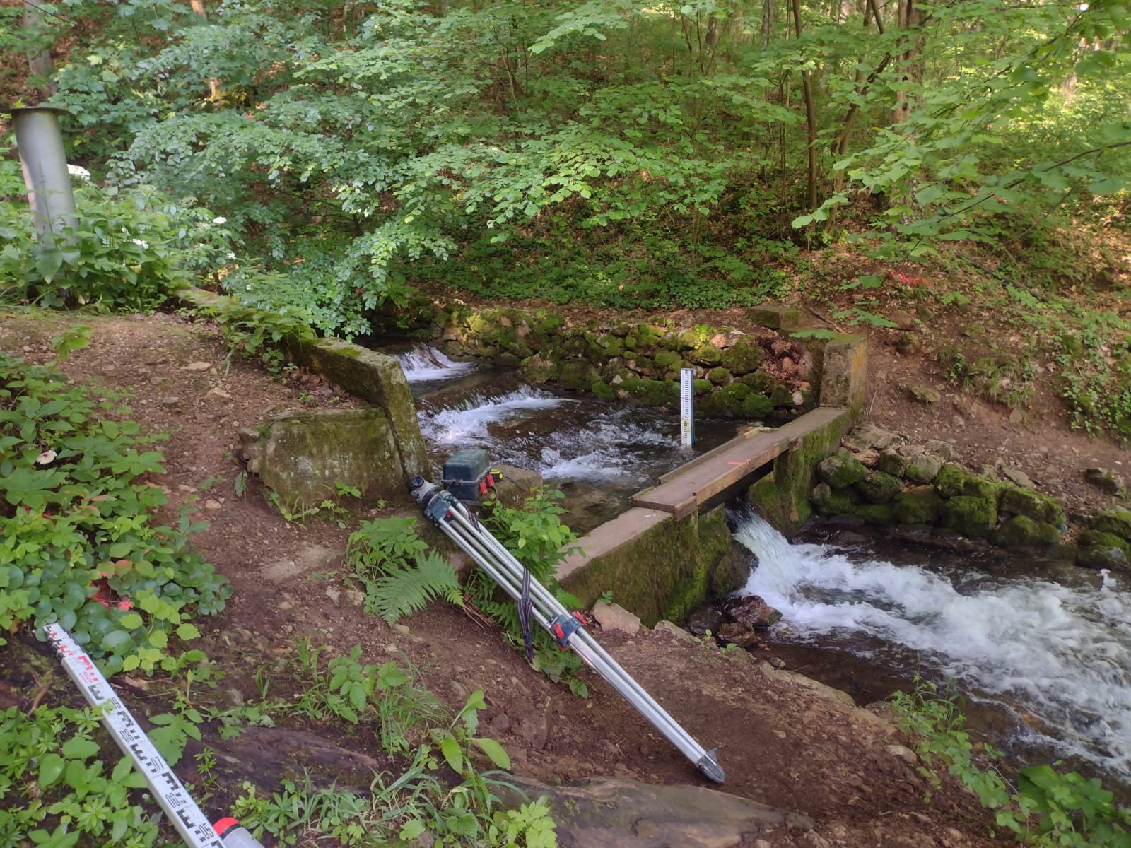 Obr. 5. Pred začatím prác. Je na nich vidno merný objekt (prepadový múr) a nad ním kaskády. Tieto kaskády boli súčasťou výstavby starého merného objektu pred rokom 1958 a umelo ich vytvoril zhotoviteľ z drevených guľatín – rokmi sa na nich vyzrážal vápenec a pokryl machom. Nová projektová dokumentácia taktiež počíta s drevenou kaskádou. Sanáciu objektu nebolo možné vykonať ručne. Príslušné povolenia má SHMÚ k dispozícii.