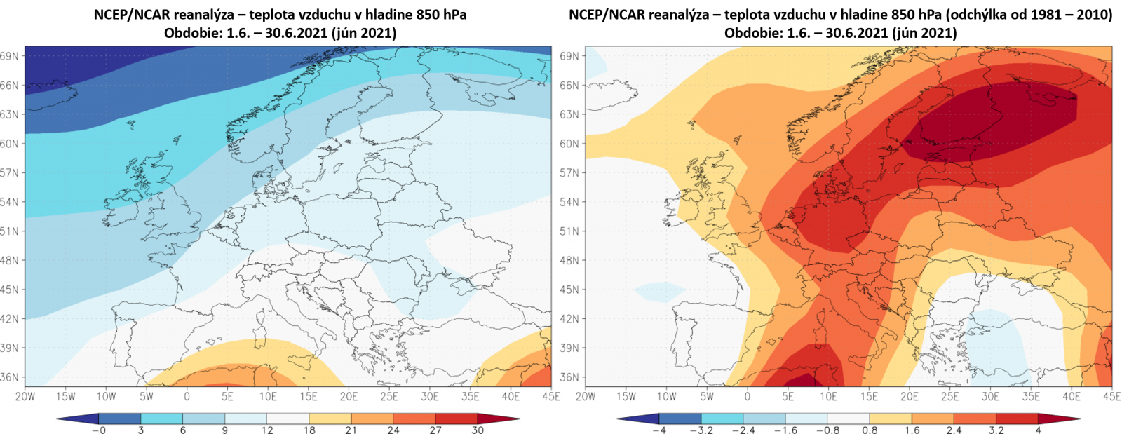 ▲ Obr. 2: Reanalýza priemernej teploty vzduchu v hladine 850 hPa (vľavo - absolútne hodnoty; vpravo - odchýlka od normálu 1981 - 2010) v období 1.6. - 30.6.2021 (zdroj: NCEP/NCAR).