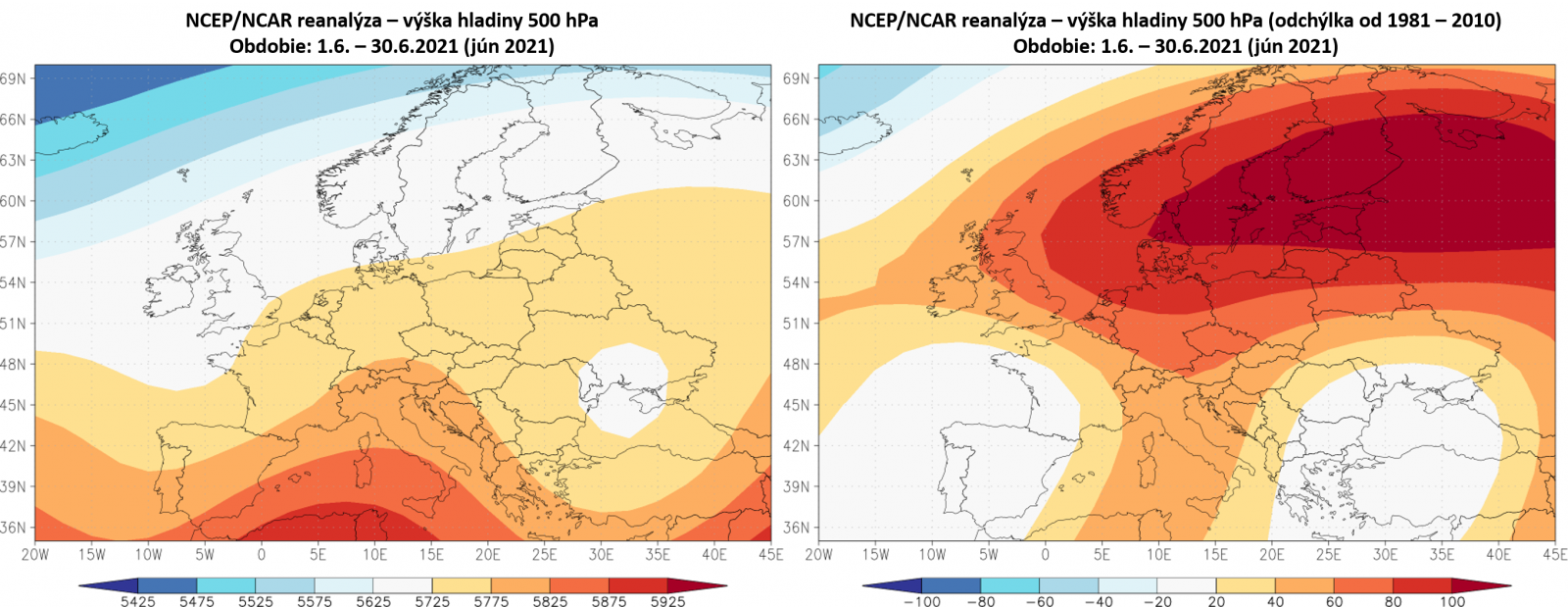 ▲ Obr. 1: Reanalýza priemernej výšky hladiny 500 hPa (vľavo - absolútne hodnoty; vpravo - odchýlka od normálu 1981 - 2010) v období 1.6. - 30.6.2021 (zdroj: NCEP/NCAR).