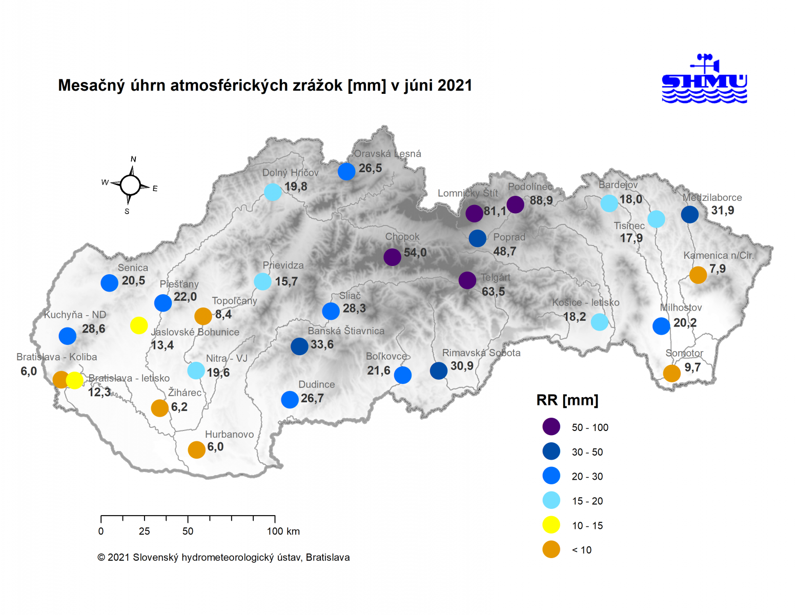 V júni 2021 boli mesačné úhrny atmosférických zrážok na Slovensku ovplyvnené nedostatkom zrážok. Minimálne množstvo oblačnosti a len sporadický výskyt atmosférických zrážok viedli k tomu, že jún ako celok sa zaradil medzi najsuchšie júny v histórii meteorologických pozorovaní na území Slovenska. Okrem toho, výrazný podiel na celkovom mesačnom úhrne zrážok v tomto mesiaci mali zrážky, ktoré padali pri búrkach. Takže mohli byť v mesačných úhrnoch zrážok zaznamenané výrazné rozdiely v rámci analyzovaného územia.
