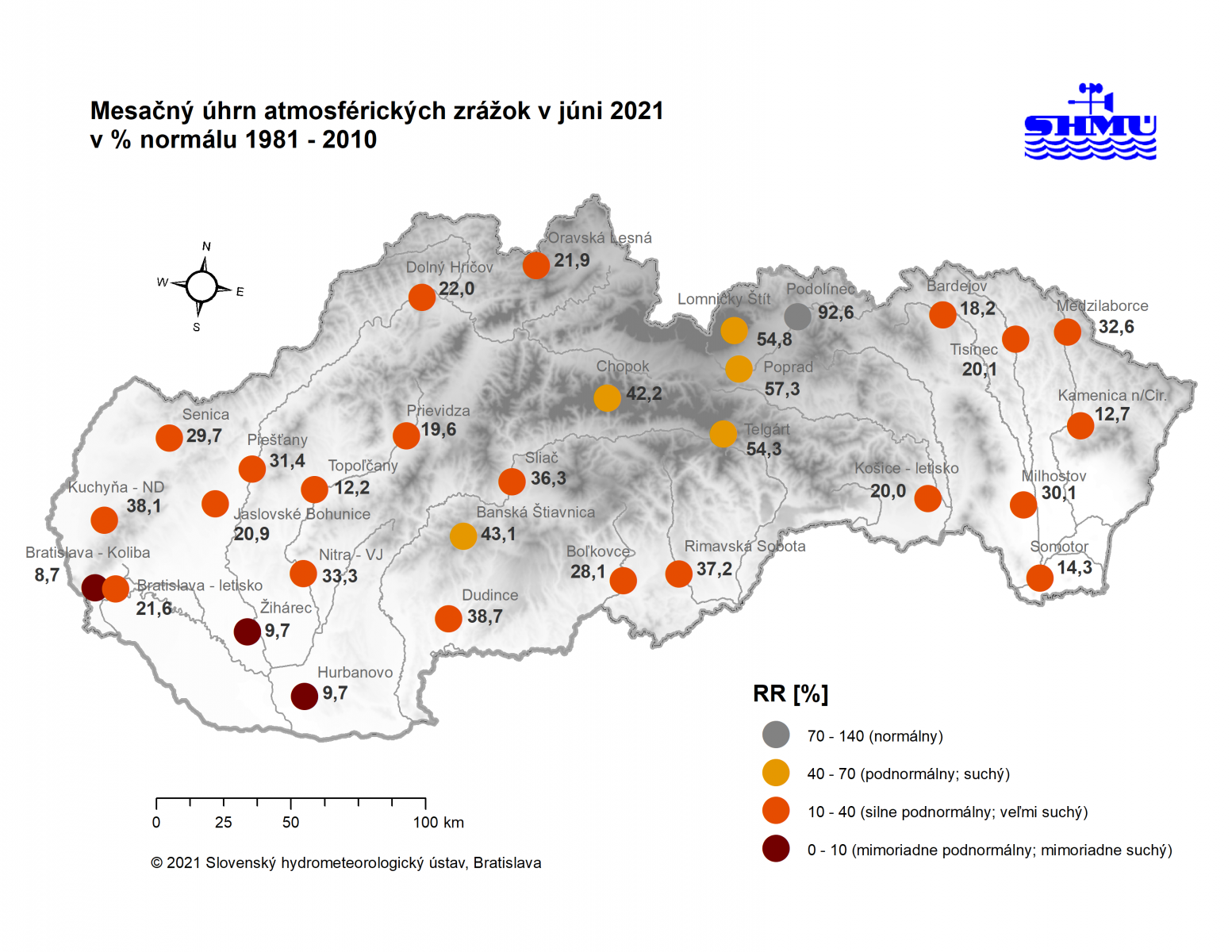 Z pohľadu mesačného úhrnu atmosférických zrážok skončil jún 2021 ako prevažne silne podnormálny (veľmi suchý), na juhu a juhozápade Slovenska miestami až ako mimoriadne podnormálny (mimoriadne suchý). Mesačný úhrn zrážok v júni bol väčšinou v intervale od 20 do 40 mm, výrazne menej zrážok však spadlo na západnom a juhozápadnom Slovensku (Hurbanovo 6,0 mm, Bratislava-Koliba 6,0 mm, Žihárec 6,2 mm), ale aj na východnom Slovensku (Kamenica n/Cr. 7,9 mm, Somotor 9,7 mm). Najmenej pritom spadlo v Častej 1,8 mm, v Gbelcoch 2,8 mm, v Sládkovičove 2,8 mm a v Sološnici 3,0 mm. Najvyšší mesačný úhrn atm. zrážok bol v priebehu júna zaznamenaný v Tatranskej Javorine 126,2 mm, v Regetovke 133,9 mm, v Malcove 127,1 mm a v Remetských Hámroch 125,8 mm.