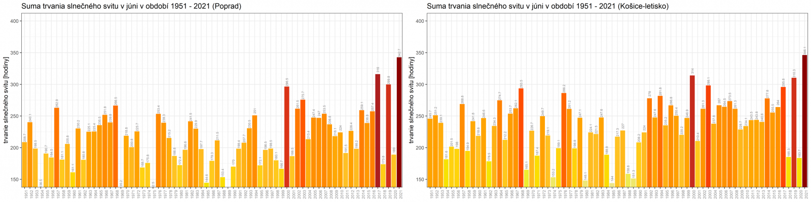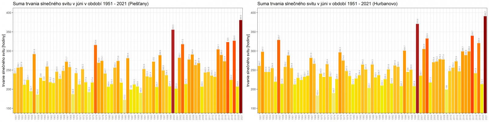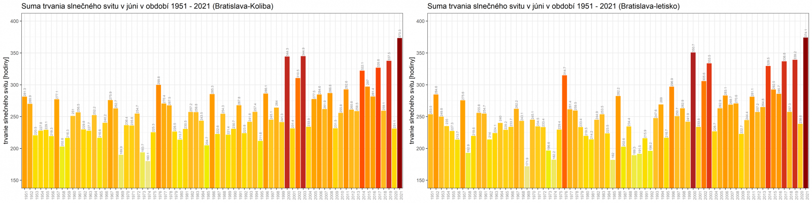 Jún 2021 bol zaujímavý aj z pohľadu celkového mesačného trvania slnečného svitu, a v tom to kontexte ho nemožno nazvať inak ako „historický“. Mesačná suma trvania slnečného svitu bola na veľkom počte staníc mimoriadne až extrémne vysoká, na 68 meteorologických staniciach bol prekonaný júnový a 52 staniciach celoročný rekord trvania slnečného svitu. Na piatich meteorologických staniciach dosiahla mesačná suma slnečného svitu hodnoty 390 hodín a viac: Veľké Lovce (397,5 h), Kamanová (395,7 h), Nitra-Veľké Janíkovce (391,5 h), Kráľová pri Senci (390,9 h) a Hurbanovo (390,7 h). Hodnota 397,5 h (V. Lovce) predstavuje súčasne nový celoštátny (a celoročný) rekord v mesačnej dĺžke trvania slnečného svitu.