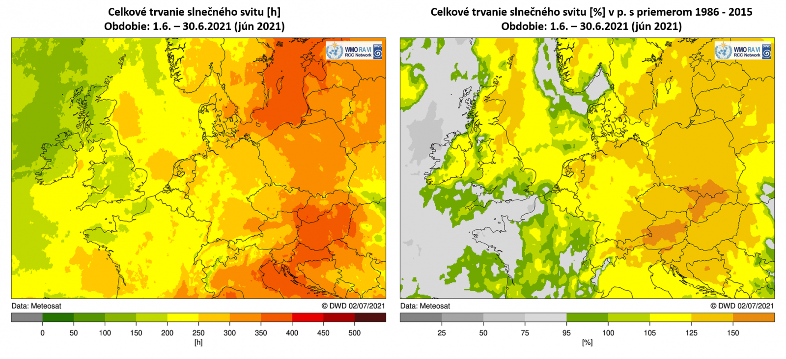 ▲ Obr. 7: Mesačná suma trvania slnečného svitu v strednej Európe v júni 2021 v hodinách (vľavo) a % dlhodobého priemeru 1986 - 2015 (vpravo; zdroj: DWD, WMO).