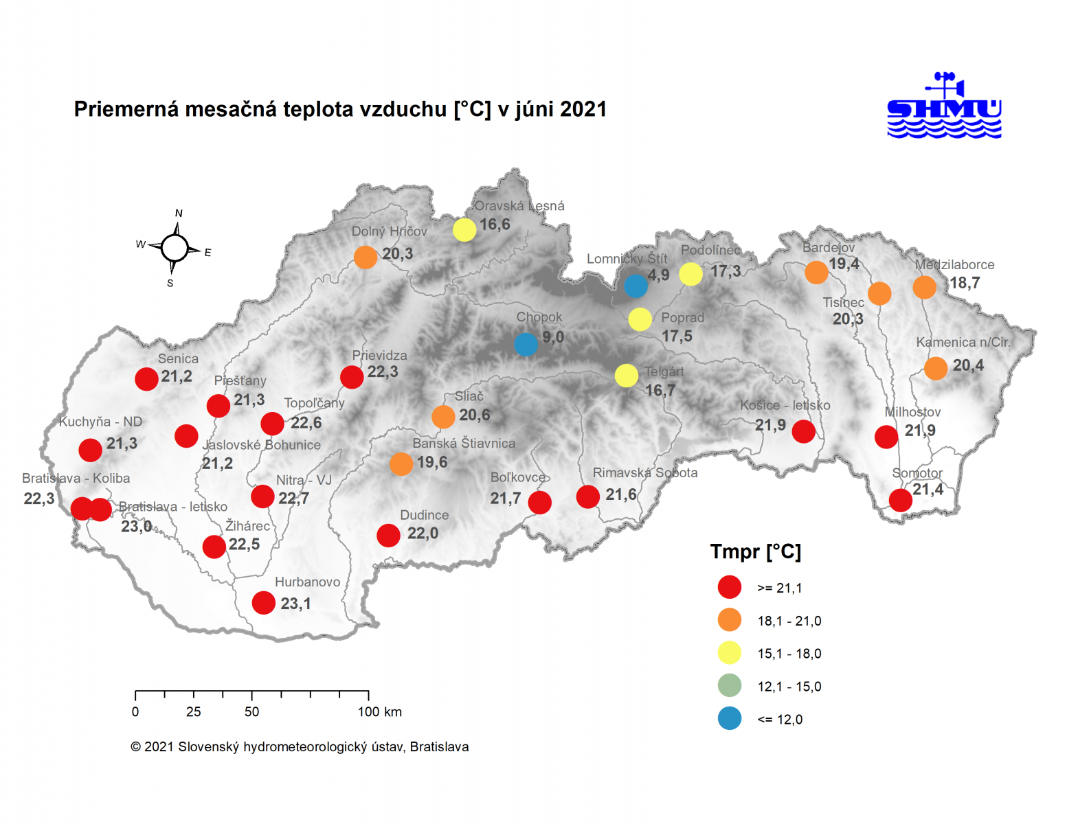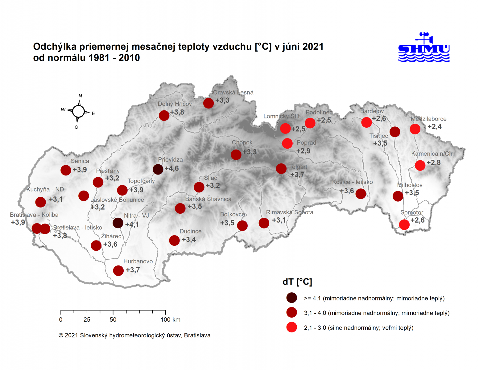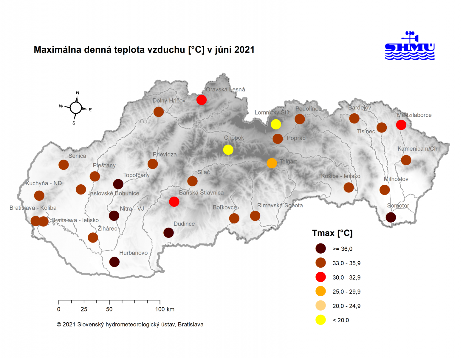 Vo štvrtok 24.6.2021 sme na Slovensku druhýkrát v histórii meteorologických pozorovaní zaznamenali v júni teplotu vzduchu 38,0 °C, a to na meteorologickej stanici Mužla. Bolo to iba o 0,2 °C menej ako predstavuje rekordne vysoká celomesačná hodnota maximálnej dennej teploty vzduchu pre jún, nameraná 30.6.2012 v Slovenskom Grobe. Na aspoň 37 °C teplota vystúpila taktiež v Dolných Plachtinciach a v Somotore (zhodne 37,0 °C). Zaznamenali sme takisto množstvo vyrovnaných, resp. prekonaných staničných extrémov maximálnej teploty vzduchu, ako aj sérií dní so špecifickou teplotou vzduchu pre mesiac jún (viac informácii v predošlej analýze k prvej tohtoročnej vlne horúčav).
