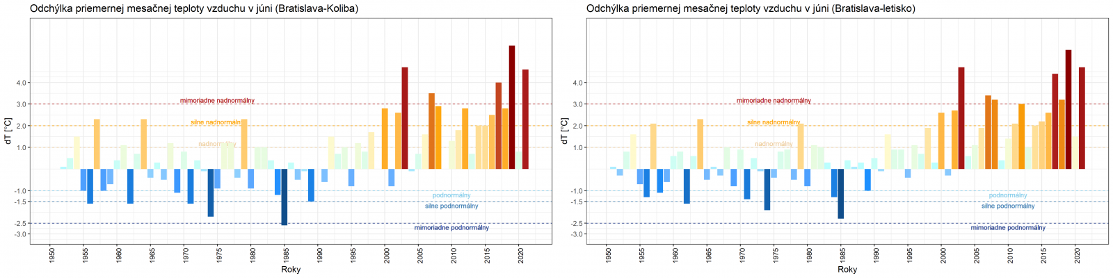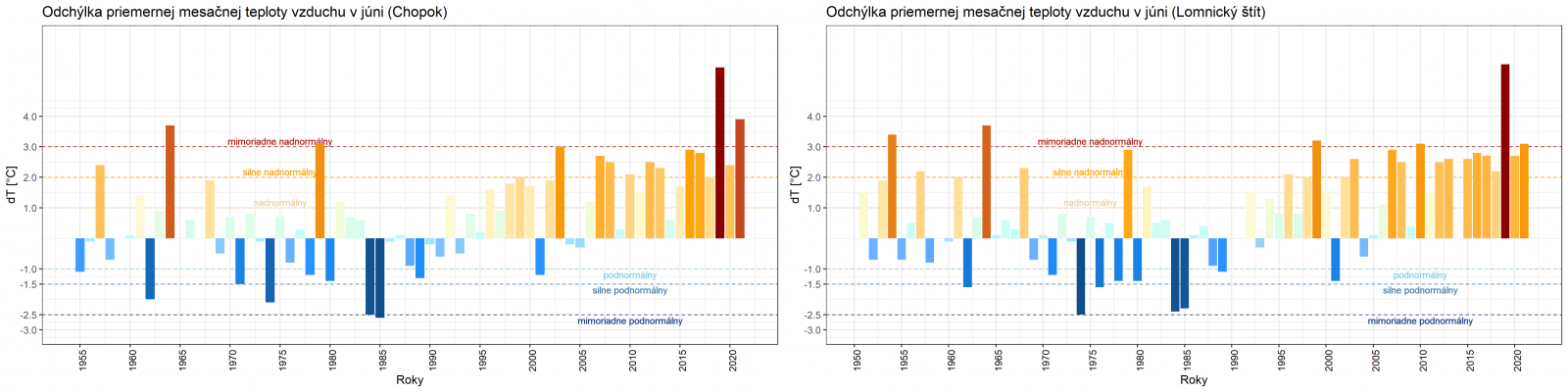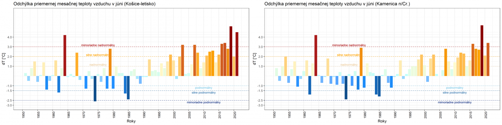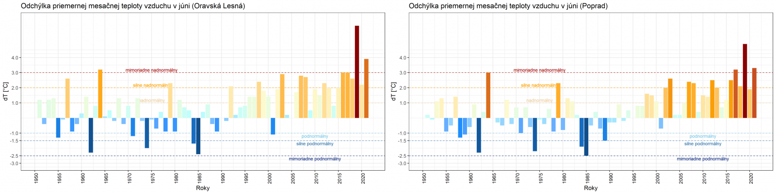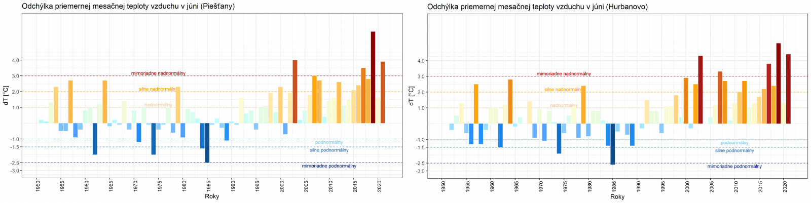 Jún bol na väčšine územia teplotne mimoriadne nadnormálny (mimoriadne teplý), výnimkou boli len regióny na krajnom východe a severovýchode Slovenska, v Popradskej kotliny a oblasti Vysokých Tatier, kde mesiac bol teplotne silne nadnormálny (veľmi teplý). Odchýlka priemernej mesačnej teploty vzduchu od normálu 1981 – 2010 bola prevažne v intervale od +3,0 do +4,0 °C, relatívne teplejšie bolo napríklad v Prievidzi (+4,6 °C) alebo v Nitre (+4,1 °C). Naopak, relatívne chladnejšie bolo napríklad v Medzilaborciach (+2,4 °C), v Podolínci a na Lomnickom štíte (+2,5 °C), alebo v Somotore a Bardejove (2,6 °C).