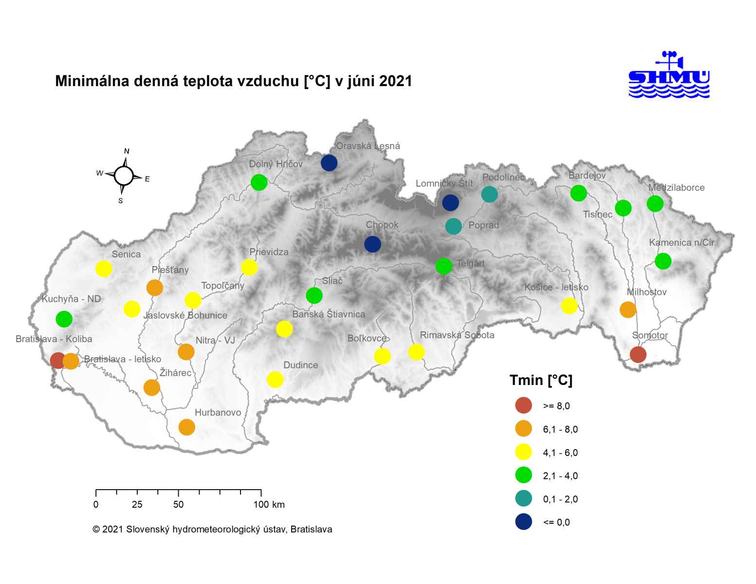 Najnižšia teplota vzduchu bola v priebehu júna 2021 zaznamenaná (mimo vysokohorských polôh) v Oravskej Polhore dňa 1.6.2021 (1,6 °C) a vo vysokohorskom polohách v rovnakom termíne na Lomnickom štíte (-6,2 °C).