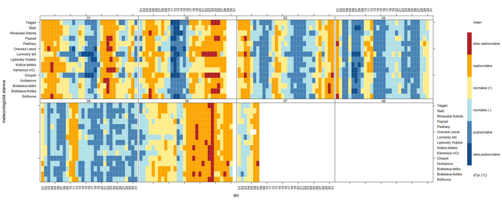 ▲ Obr. 6: Vývoj odchýlky priemernej dennej teploty vzduchu [°C] od normálu 1981 - 2010 na vybraných meteorologických staniciach v období od 1.1. do 8.7.2021; na oxi x-ovej sú dni v mesiaci a mesiace január - august 2021 sú označené číselnými hodnotami 01 - 08 (zdroj: SHMÚ).