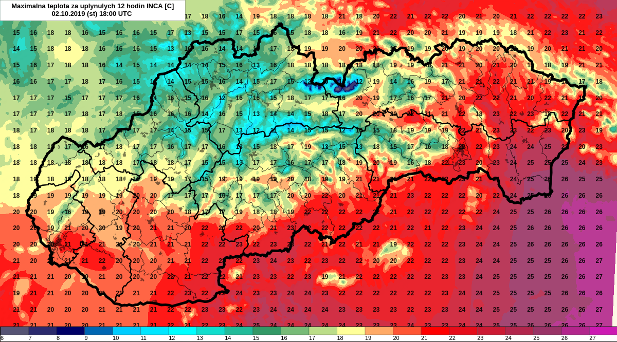Obr. 1 - Porovnanie maximálnej teploty vzduchu 2. a 3.10.2019 z analýz INCA.