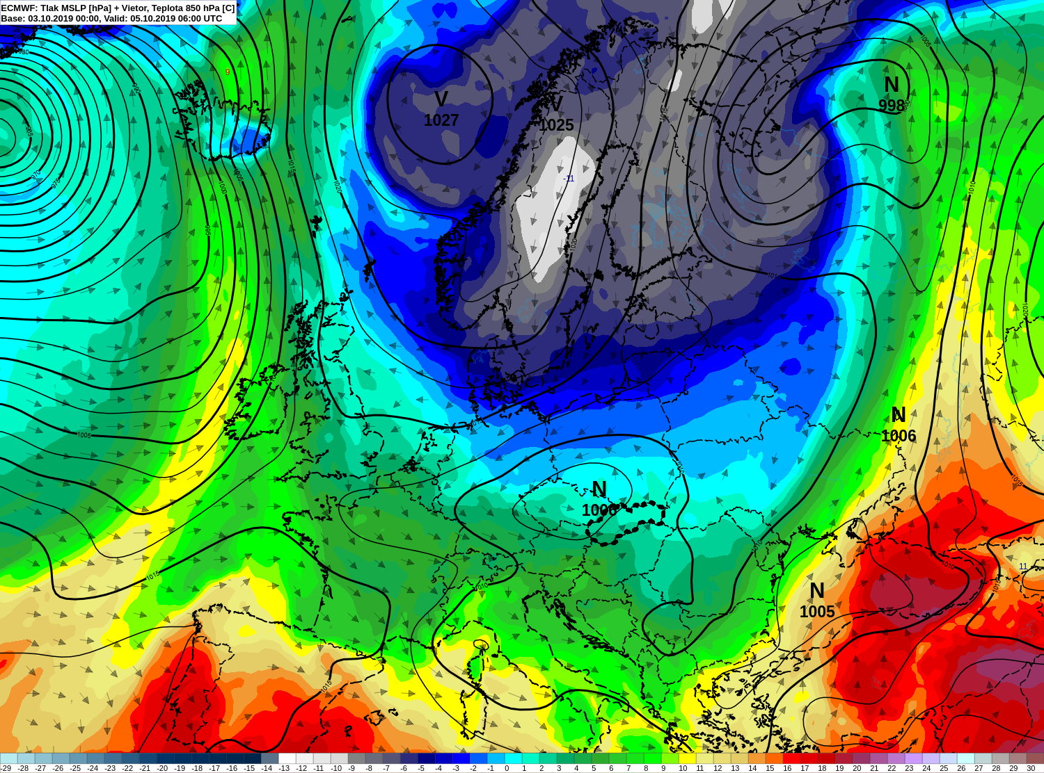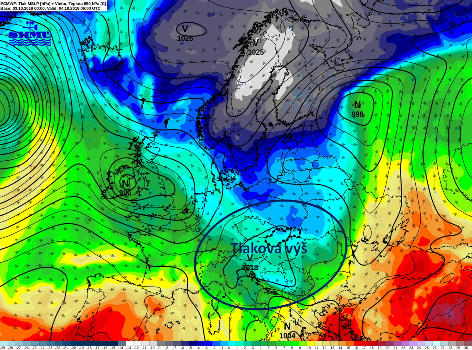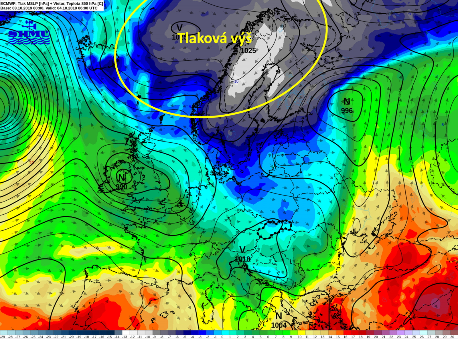 Animácia 1 - Tlak vzduchu prepočítaný na hladinu mora (čierne izočiary) a teplota vzduchu v hladine 850 hPa (výška cca 1400-1500 m n. m.) z modelu ECMWF pre obdobie 2.10.2019 až 8.10.2019.