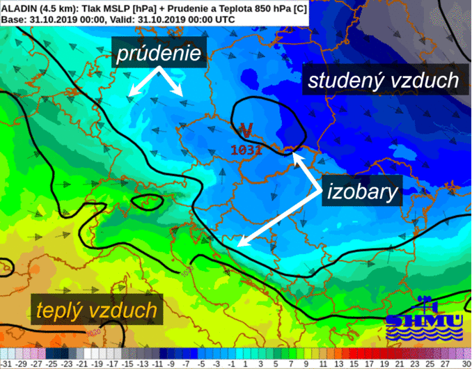 Na animácii nižšie môžete vidieť, že dňa 31.10. sa v studenom vzduchu presúval stred tlakovej výše so Severného mora cez strednú Európu až do našej oblasti. V nasledujúcich hodinách sa stred tlakovej výše presunul ďalej smerom na východ a po jej zadnej strane k nám začal vo vyšších vrstvách ovzdušia prúdiť teplejší vzduch od juhozápadu. Prílev teplého vzduchu do našej oblasti zosilnel za teplým frontom, ktorý postupoval cez strednú Európu 1. a 2.11. a následne k nám prúdenie teplého vzduchu pokračovalo po prednej strane rozsiahlej tlakovej níže so stredom nad Britskými ostrovmi.