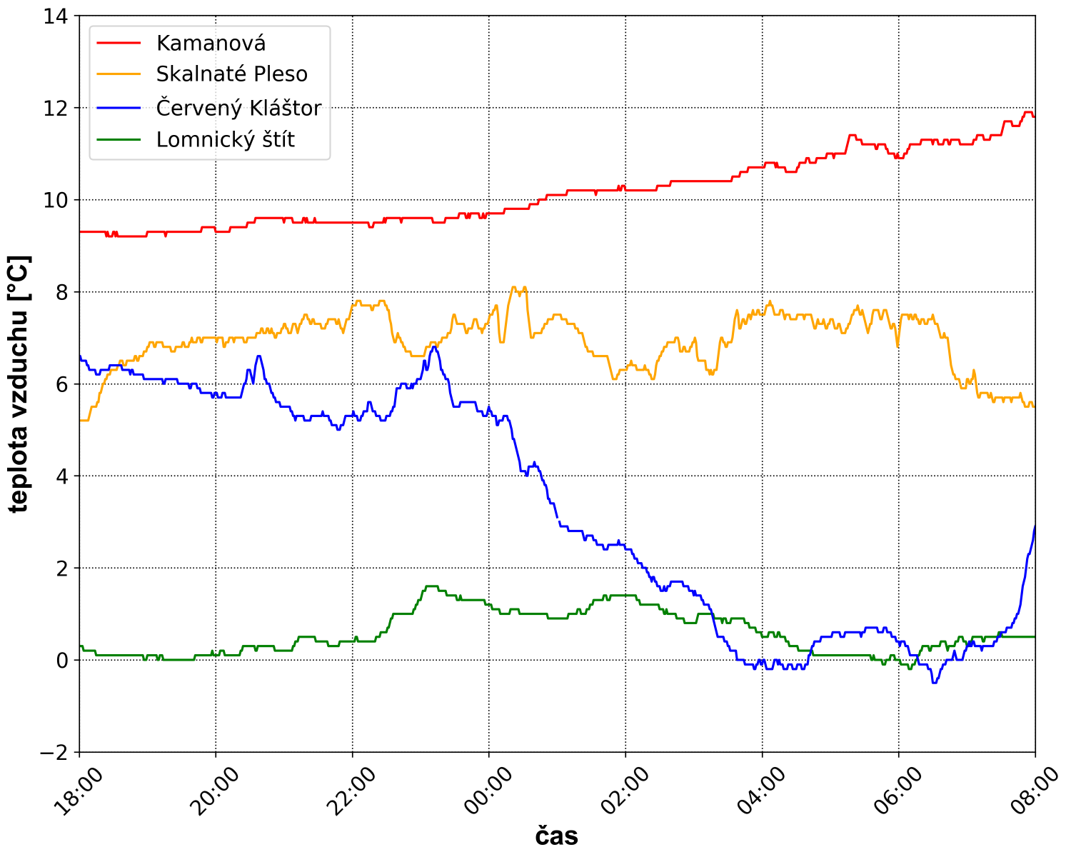 Na obrázku č. 4 ponúkame priebeh teploty vzduchu počas poslednej noci na štyroch staniciach s rozdielnou polohou v rámci Slovenska. Prvou stanicou je už spomínaná Kamanová. Priebeh teploty na tejto stanici je citlivý predovšetkým na juhovýchodný vietor, ktorý premiešava prízemnú vrstvu ovzdušia a bráni tak poklesu teploty vzduchu. Naopak v Červenom Kláštore, ktorý má dolinovú polohu, bol pokles teploty vzduchu aj počas poslednej noci neporovnateľne výraznejší ako napríklad v Kamanovej (v noci tu ešte nefúkal vietor). Podobne sa pri príleve teplého vzduchu v zimnom období "správajú" aj iné dolinové polohy predovšetkým v Banskobystrickom kraji. Nakoniec sa pozrime na priebeh teploty na Lomnickom štíte a na stanici Skalnaté Pleso. Môžeme vidieť, že teplota vzduchu tu ani v noci výrazne neklesala. Príčinou bol práve silnejúci prílev teplého vzduchu vo vyšších vrstvách ovzdušia, ktorý sa výrazne prejavuje najmä na staniciach vo vysokých horských polohách.