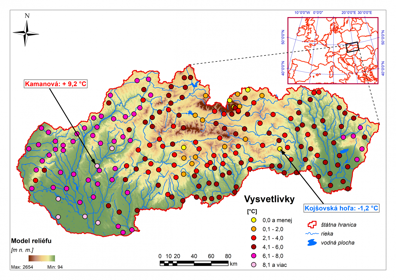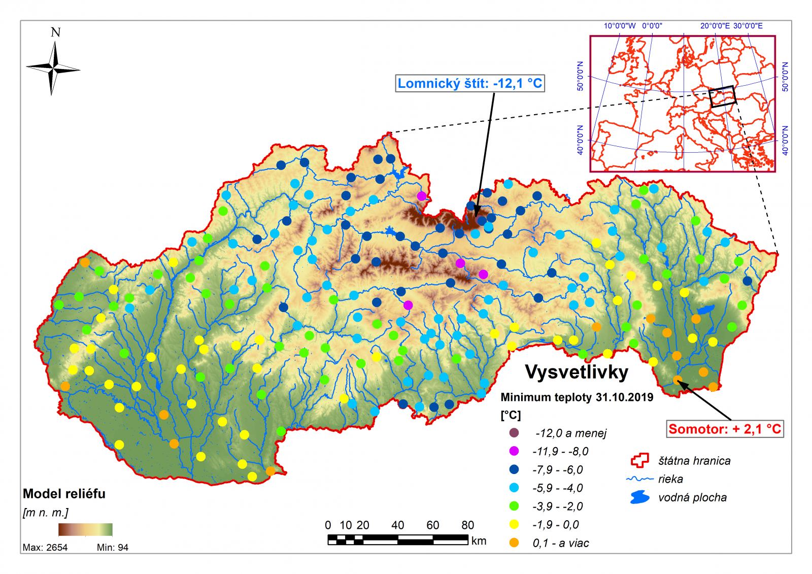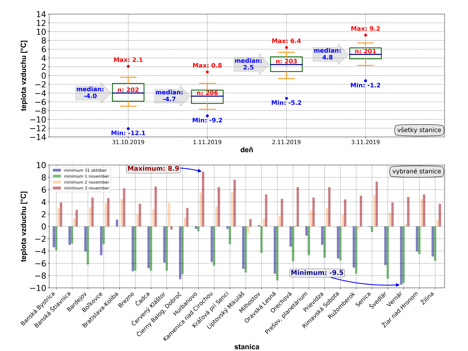 Noc z 30. na 31. októbra bola prvou kedy sa vytvorili vhodné podmienky na výraznejší pokles teploty vzduchu na našom území. S výnimkou juhozápadného Slovenska bola väčšinou zmenšená oblačnosť a na väčšine územia, okrem juhovýchodu, zoslabol vietor. Obrázok č. 1 ponúka prehľad minimálnej dennej teploty vzduchu zo všetkých dostupných automatických staníc. Najnižšia teplota bola na Lomnickom štíte, z nižších polôh to bol Vernár, kde sme namerali minimum teploty -9,5 °C. Keďže poveternostná situácia sa výraznejšie nezmenila ani nasledujúcu noc, bol predpoklad na ešte výraznejší pokles teploty vzduchu. Očakávalo sa zoslabnutie vetra, a to aj v lokalitách, kde predošlú noc vietor fúkal (spomínaný juhovýchod). Poklesu teploty vzduchu tak mohla zabrániť len veľmi ťažko predpovedateľná nízka oblačnosť alebo hmla, ktorá sa v noci mohla ojedinele vytvoriť. Ako je možné vidieť na obrázku č. 2 noc z 31.10. na 1.11. bola porovnateľné chladná, aj keď najnižšie minimum bolo vyššie ako predošlú noc. Nasledujúce dve noci sa situácia zmenila. Okrem toho, že pribudla oblačnosť, začal fúkať aj juhovýchodný až južný vietor. V noci z 1. na 2.11. bolo o poznanie teplejšie ako predošlú noc, ale stále sa vyskytli lokality, kde aj výraznejšie mrzlo. Ako je však možné vidieť na obrázku č. 3, v noci z 2. na 3.11. mrzlo už len ojedinele. Naopak lokality citlivé na juhovýchodný vietor zaznamenali pomerne teplú noc a napríklad v Kamanovej na juhozápade Slovenska bolo minimum až +9,2 °C.