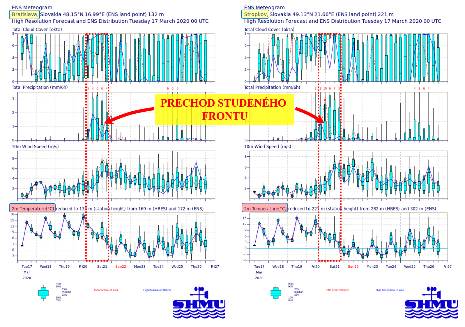 Studený vzduch, ktorý k nám prenikne počas najbližšieho víkendu, bude zrejme najchladnejší v rámci celého chladného polroku 2019/2020 (teda mesiace október marec). Charakter vzduchovej hmoty typicky posudzujeme (okrem iného) podľa teploty v hladine 850 hPa, čo v zime predstavuje nadmorskú výšku cca 1400 1500 m. Najnižšiu teplotu sme podľa aerologických sondáži v Gánovciach v tejto hladine zaznamenali 29. decembra 2019, kedy tu teplota klesla na -11.3 °C (čo je veľmi vysoká hodnota pre zimné minimum). Teraz by teplota mala klesnúť ešte nižšie, pričom napravdepodobnejšia je teplota okolo -13 °C (obr. 1). Na obrázku 2 je možné vidieť priebeh oblačnosti, zrážok, vetra a teploty vzduchu v najbližšom období v nižších polohách. Najvýraznejšie ochladzovanie, po prechode studeného frontu, je na obrázku zvýraznené červeným obdĺžnikom. Napríklad v oblasti Bratislavy by ešte v piatok malo byť maximum teploty vzduchu na úrovni okolo 18 °C, pričom v najteplejších oblastiach na juhu stredného Slovenska a na juhozápade sa maximum teploty v tento deň môže priblížiť až k 20 °C. V Stropkove (obr. 2 vpravo) môže byť už piatok chladnejším dňom ako štvrtok, avšak aj tam sa výrazne ochladí až po prechode studeného frontu. Zrážky sa vyskytnú najmä v sobotu, no budú prechodné a málo výdatné. Postupne sa rozfúka aj nepríjemný severný vietor, ktorý ešte umocní pocit chladu. Podľa aktuálnych predpovedných materiálov budú najchladnejšími dňami nedeľa a pondelok, kedy maximum teploty vzduchu bude od 2 do 7 °C, dokonca na severe budú aj lokality so slabým celodenným mrazom. Cez deň sa začne pozvoľne otepľovať od utorka. Noci a rána budú mrazivé v celej prvej polovici budúceho týždňa, a to na celom území Slovenska. V horských dolinách môžu byť minimá teploty ojedinele až okolo -15 °C.