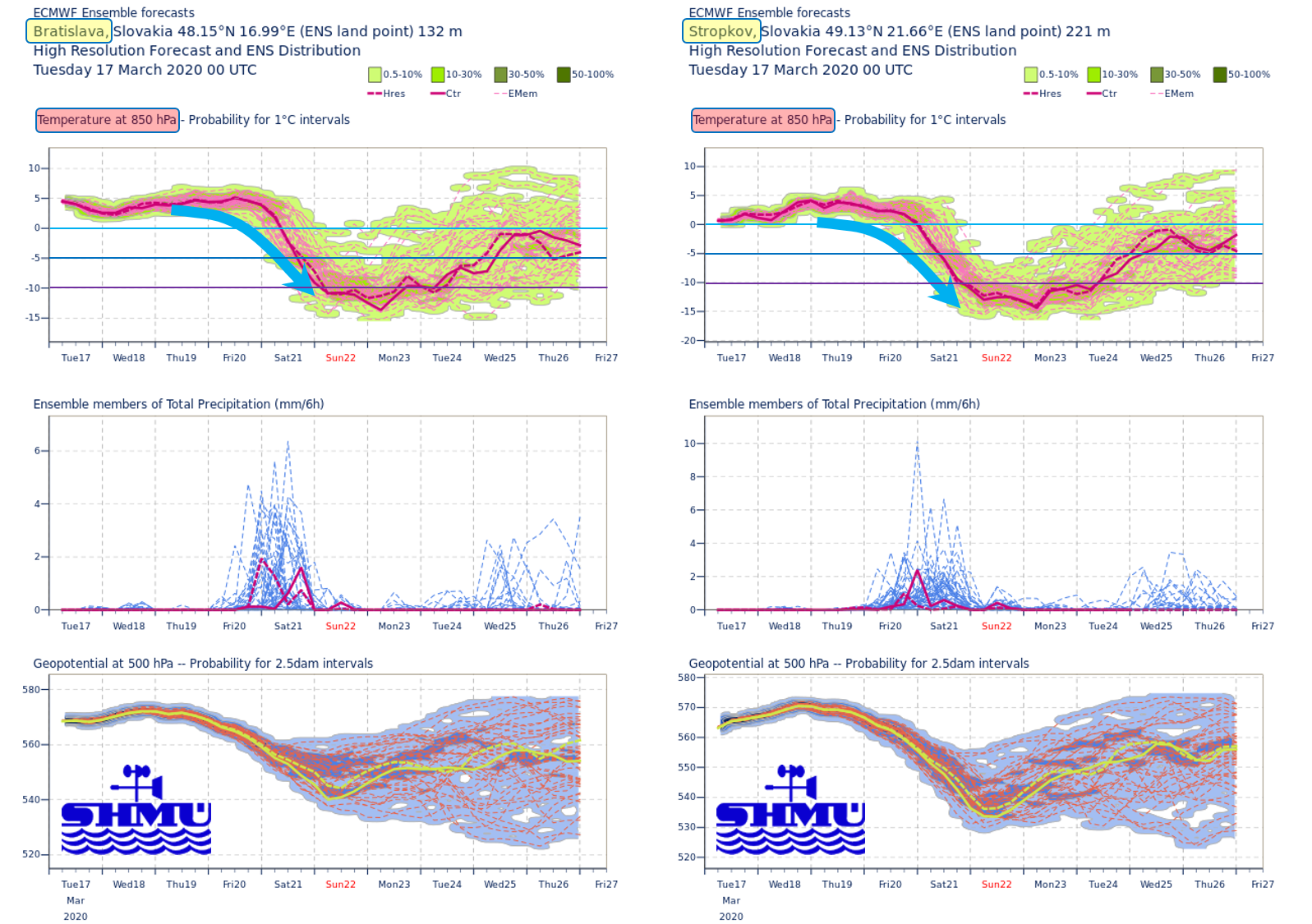 Obr. 1: Ansámblová predpoveď teploty vzduchu v hladine 850 hPa (graf v hornej tretine obrázka), zrážok (graf v strede obrázka) a výšky geopotenciálnej hladiny 500 hPa (výška okolo 5,5 km) (graf v dolnej časti obrázka) pre Bratislavu a Stropkov z modelu ECMWF.