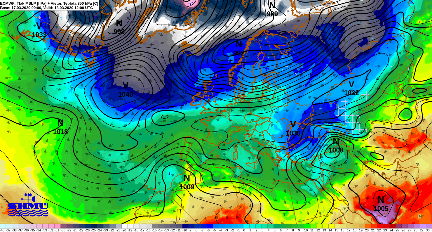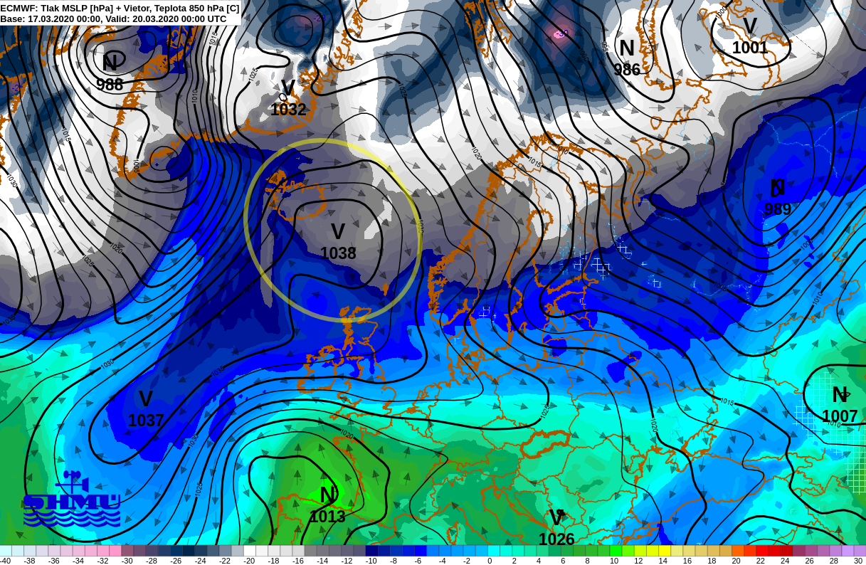 Aktuálne (17.3.2020) počasie v našej oblasti ovplyvňuje v teplom vzduchu nezvyčajne rozsiahly pás vysokého tlaku vzduchu tiahnuci sa od Azorských ostrovov až po Kaspické more. Situácia bude pretrvávať aj v stredu (18.3.) a vo štvrtok (19.3.), pričom vzduch bude ešte o niečo teplejší. Vo štvrtok sa však synoptická situácia v Európe začne pomaly meniť. Nad Poľsko a Nemecko postúpi studený front spojený s tlakovou nížou, ktorá sa prehĺbi nad severozápadným Ruskom. Za ním sa do severnej polovice Európy dostane chladnejší vzduch. Súčasne bude na zadnej strane tejto níže nad Škandináviou pretrvávať severné prúdenie, a tak sa sem v priebehu piatka (20.3.) postupne dostane studený arktický vzduch spoza polárneho kruhu. Súčasne v noci na piatok v oblasti Islandu rýchlo zmohutnie tlaková výš a postupne sa bude presúvať nad centrálnu Európu (bude sa bude presúvať presne do oblastí, kam prúdi studený vzduch, o príčine tohto procesu viac TU). Po jej prednej strane sa v priebehu víkendu dostane aj nad naše územie studený, pôvodom arktický vzduch. Celý vývoj je zobrazený na animácii nižšie.