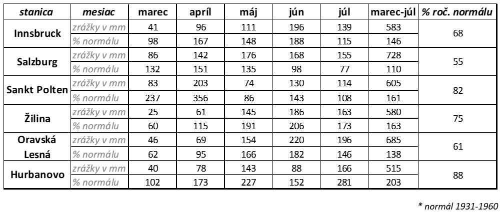 Tab. 1: Mesačné úhrny zrážok na vybraných staniciach v povodí Dunaja a na Slovensku v porovnaní s normálom (Hronec et al, 1969).
