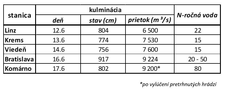 Tab. 2: Prehľad dosiahnutých kulminačných stavov a prietokov na Dunaji v júni 1965 (Hronec et al, 1969).