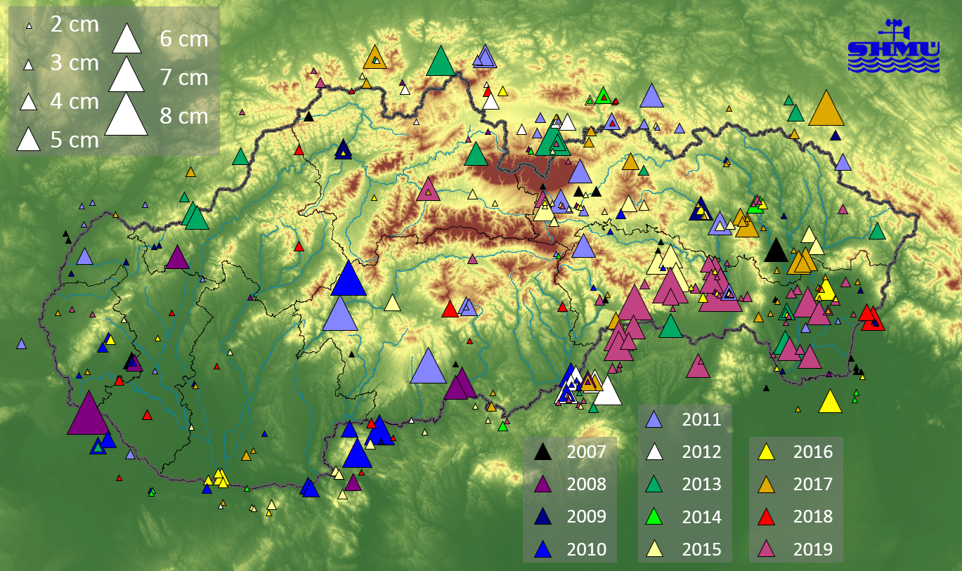 ▲ Obr. 1: Všetky záznamy krúp na Slovensku a v okolí 15 km od slovenských hraníc v období 1.1.2007 – 30.9.2019, veľkosť symbolov predstavuje maximálny priemer krúp, farba predstavuje rok, v ktorom boli krúpy zaznamenané (legenda v obrázku).