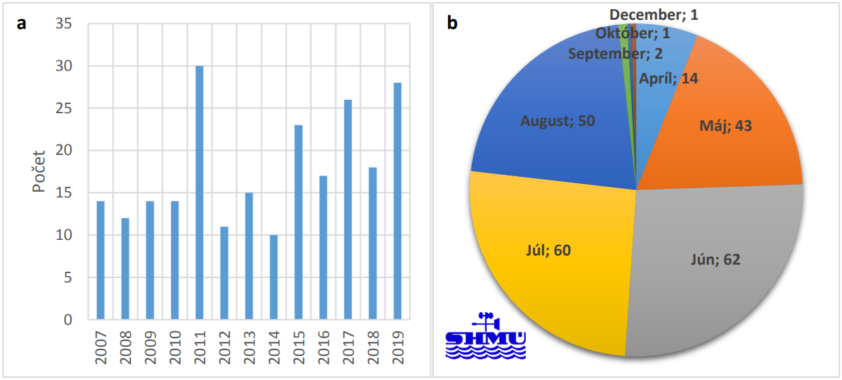 Na Slovensku a v blízkom pohraničí (do 15 km) sme za sledované obdobie celkovo identifikovali 232 buniek, ktoré vyprodukovali krúpy 2cm+. Ročne sme v priemere zaznamenali 18 takýchto buniek, pričom najviac ich bolo v r. 2011, až 30, naopak najmenej - 10 - v r. 2014 (obr. 3a). Najvyšší výskyt buniek s obrovskými krúpami (5cm+) sme zaznamenali v r. 2019, kedy ich bolo 9 a v roku 2011 8, no šlo o extrémy a vo väčšine rokov (8/13 rokov) sa vyskytli len 1-3 takéto bunky (obr. 2b). Pre analýzu príčinných súvislostí rozdielov početnosti výskytu krúp v rámci jednotlivých rokov však bude nutná podrobnejšia analýza atmosférických podmienok, ktoré v daných rokoch a situáciách prevládali. Taktiež sme vyhodnocovali, kedy v rámci roka sa veľké krúpy vyskytujú najčastejšie (obr 3b). Nie je prekvapivé, že najčastejšie sa vyskytli v čase, kedy sú u nás najvhodnejšie podmienky pre vývoj prehánok a búrok, čo je v lete a v druhej polovici jari. Naopak na jeseň a v zime bol ich výskyt mimoriadne zriedkavý - len 4 prípady za mesiace september až marec.