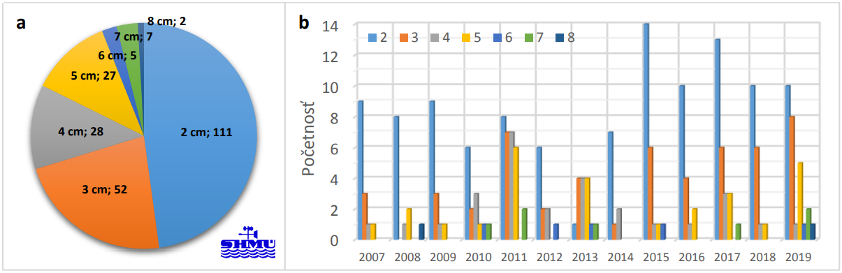 Väčšina buniek vyprodukovala krúpy s priemerom 2 cm - až v takmer polovici prípadov, v niečo menej ako štvrtine 3 cm, po osmine prípadov tvorili 4 a 5 cm (obr. 4a). Výrazný pokles sme zaznamenali pri bunkách s krúpami 6cm+, ktoré tvorili len 6 % všetkých buniek. Najväčšie krúpy na území Slovenska a v blízkom okolí mali 8 cm a zaznamenali sme ich 7.7.2008 v Maďarsku južne od Bratislavy a 27.6.2019 v Košiciach. To však nevylučuje, že sa u nás v minulosti nevyskytli, resp. v budúcnosti nemôžu vyskytnúť aj väčšie krúpy. Svedčia o tom aj staršie záznamy z blízkeho pohraničia Slovenska, kde boli zaznamenané krúpy s priemerom až okolo 10 cm, prípadne záznamy z ďalších európskych krajín, kde sa vyskytli ešte väčšie krúpy. Tie najväčšie boli zaznamenané 20. júna 2016 v Sânandrei v západnom Rumunsku a ich priemer dosahoval až 15 cm, prípadne 14 cm 6. augusta 2013 v Undingen v juhozápadnom Nemecku a 10. júla 2019 v talianskom meste Pescara. Všetky spomínané udalosti spôsobili obrovské škody na majetku, porastoch a zranili mnoho ľudí.