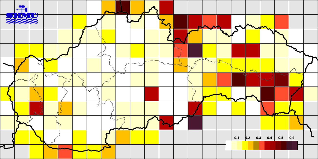 Pre vyhodnotenie početnosti výskytu krúp v určitej oblasti sme zvolili gridovú sieť 20x20 km, pričom pre jeden štvorec sme použili najviac jeden záznam z jednej bunky. Počet záznamov v jednotlivých štvorcoch sme následne vydelili počtom analyzovaných rokov, z čoho sme dostali odhad relatívnej početnosti výskytu krúp 2cm+ a 5cm+ v jednotlivých štvorcoch počas sledovaného obdobia (keďže počet záznamov v jednotlivých štvorcoch gridovej siete je závislý od konkrétneho umiestnenia gridovej siete, pri interpretácii výsledkov je vhodné sa viac zameriavať na jednotlivé oblasti, ako na konkrétne štvorce). Najčastejší výskyt krúp 2cm+ sme identifikovali na východnom Slovensku, predovšetkým vo Východoslovenskej nížine, vo východnej polovici Volovských vrchov a priľahlej časti Košickej kotliny, v okolí Prešova a v Popradskej kotline, väčšinou raz za dva až tri roky. Vyššia početnosť je aj na Zamagurí, na pohraničí stredného Slovenska – s Poľskom i s Maďarskom, ako aj v pohraničných oblastiach v okolí juhu západného Slovenska. Pri porovnaní s obr. 1 však vidíme, že v pohraničných oblastiach ide vo väčšine prípadov o záznamy mimo územia Slovenska, čo však nevylučuje, že sa krúpy mohli vyskytnúť aj na Slovensku. Výsledky prác zameraných na výskyt krúp v okolitých štátoch nadväzujú na tieto výsledky. Podobne, ako sme popisovali obr. 1, aj na obr. 4 vidieť, že väčšina západného, stredného Slovenska, Horného Zemplína, horného Šariša vykazuje len nízku početnosť výskytu, väčšinou do 0,1 (zvýšená početnosť v okolí Senca a v strede Banskobystrického kraja súvisí s vyšším reportovaním udalostí z daných lokalít).