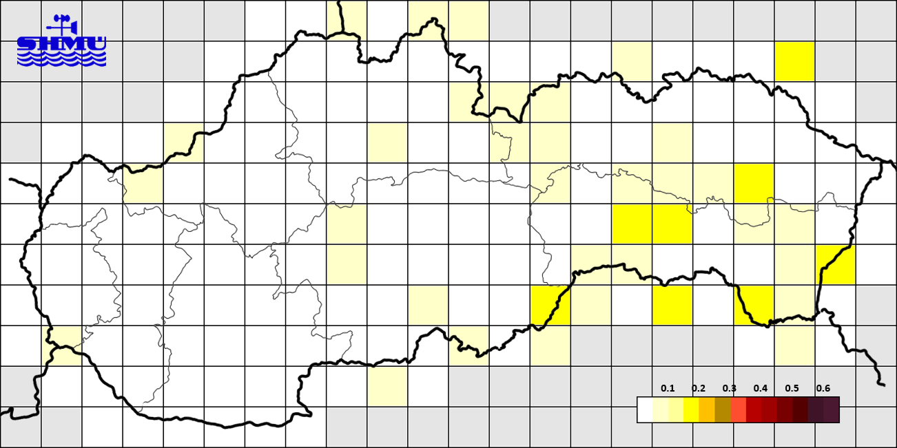 - Využili sme aj možnosť interpretácie výskytu krúp v gridovej sieti 20x20 km, no tu je negatívny efekt nehomogénneho množstva údajov v rámci analyzovaných rokov výraznejší, čo neumožňuje vyhodnocovať trend vo výskyte veľkých krúp na území Slovenska (je nutný dlhší časový rad). Z hľadiska priestorovej distribúcie však predpokladáme rovnomerné podhodnotenie v rámci celého územia, čo nám umožňuje interpretovať aspoň regionálne rozdiely.