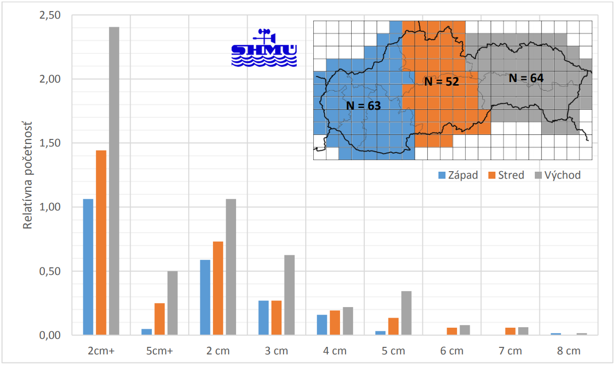 Pre ilustráciu regionálnych rozdielov sme záznamy o krúpach opäť umiestnili do gridovej siete s rozmerom štvorca 20x20 km, územie Slovenska sme rozdelili na západ, stred a východ a plochu sme normovali na počet štvorcov v danej oblasti a na jednu bunku, vďaka čomu sme ich mohli porovnávať. Na obr. 7 je zobrazená normovaná početnosť v jednotlivých oblastiach pre krúpy 2cm+, 5cm+, ako aj pre jednotlivé veľkosti krúp. Vzhľadom na už odprezentované výsledky nie je prekvapivé, že najvyššia početnosť výskytu veľkých krúp je na východe Slovenska. Interpretácia je teda nasledovná: krúpy 2cm+ sa na východe v každom štvorci priemerne za celé sledované obdobie vyskytli takmer 2,5-krát. Pomerne vysokú početnosť, až 0,5 na štvorec, tu vykazujú aj krúpy 5cm+. V strede oblasti bola početnosť nižšia, 2cm+ približne 1,5-krát a 5cm+ 0,25/štvorec, čo je cca o polovicu menej, ako na východe. Najnižšia početnosť bola na západe, kde sa krúpy 2cm+ v každom štvorici priemerne vyskytli raz za celé sledované obdobie, pričom početnosť 5cm+ bola veľmi nízka, len 0,05/štvorec, čo je až desaťnásobne menej, ako na východe oblasti.