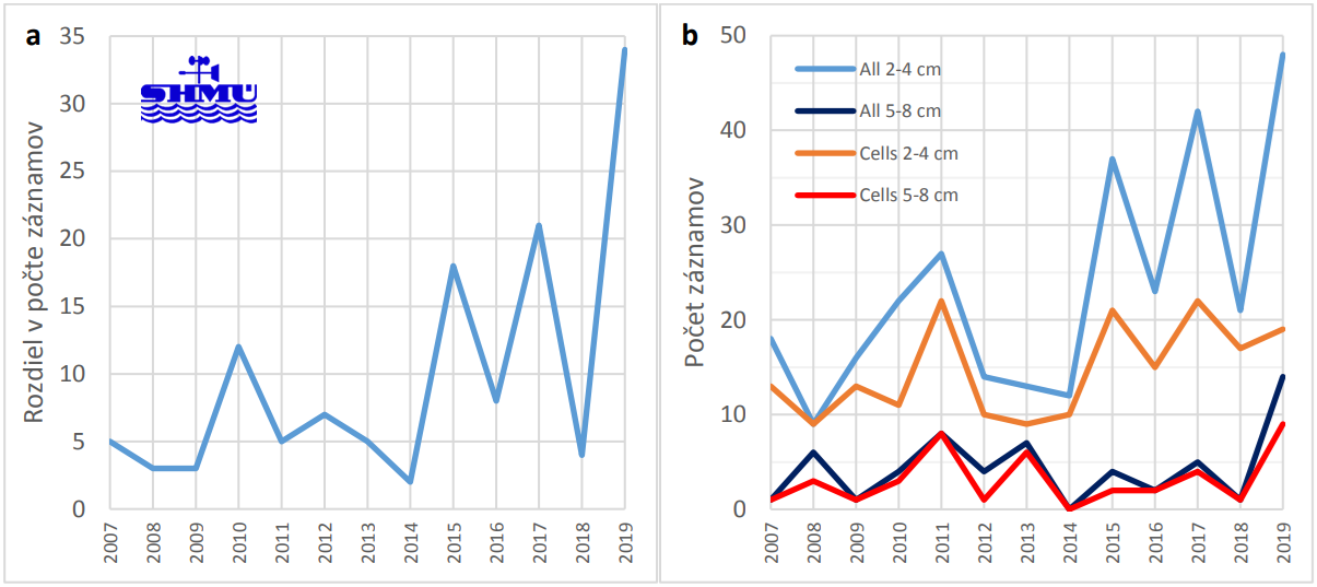 ▲ Obr. 4: (a) Počet buniek s krúpami s maximálnou veľkosťou krúp v cm uvedenou v grafe, (b) ich distribúcia v jednotlivých rokoch, všetky údaje sú pre jednotlivé bunky.
