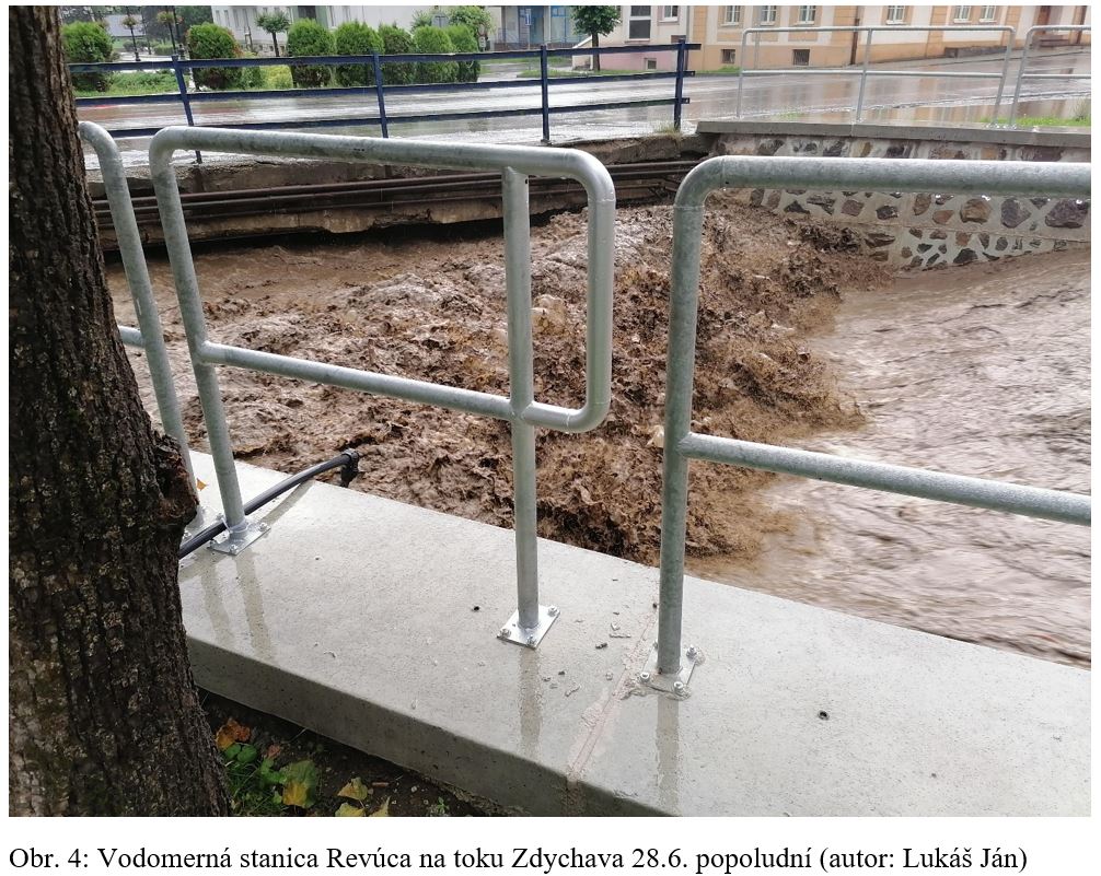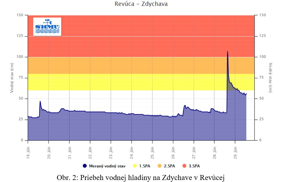 Zasiahnuté povodie Zdychavy (ľavostranný prítok rieky Muráň) reagovalo na takéto extrémne zrážky výrazným a rýchlym vzostupom. Hladina Zdychavy v Revúcej stúpla z 33 cm o 14:00 na 108 cm o 15:15, čo zodpovedá prekročeniu 3. SPA (obr. 2).