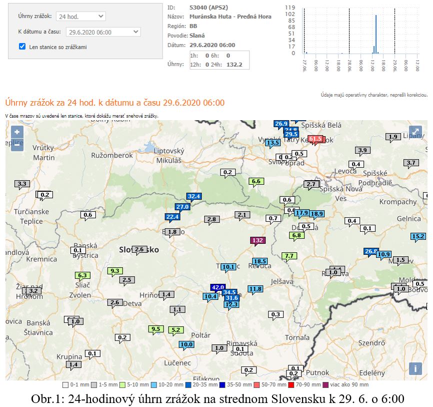 V nedeľu 28. 6. sme opätovne zaznamenali extrémne silné búrky, lokalizované do východnej časti Slovenského rudohoria. Z nich najvýraznejšia sa vyskytla na Muránskej planine, s hodinovým úhrnom 102,4 mm k 14:00. Vďaka pomalému pohybu búrok, ako aj ich obnovovaniu nad tým istým miestom, zrážkomerná stanica Muránska Huta – Predná Hora zaznamenala celkový 24-hodinový úhrn 132 mm (obr. 1). Priestorové rozloženie úhrnov zrážok pri takejto búrkovej situácii je mimoriadne nerovnomerné (obr. 1). Meteorologická stanica na Telgárte, vzdialená vzdušnou čiarou len 11 km zaznamenala celkový denný úhrn len 0,7 mm.