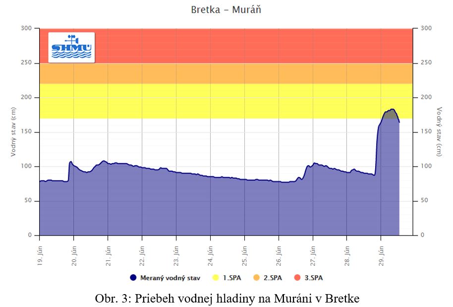 Povodňová vlna postupujúca povodím spôsobila výrazný vzostup aj v uzáverovej stanici na Muráni v Bretke – tu hladina kulminovala 29. 6. ráno o 6:00 na 183 cm. Bola prekročená hladina zodpovedajúca 1. SPA (obr. 3).