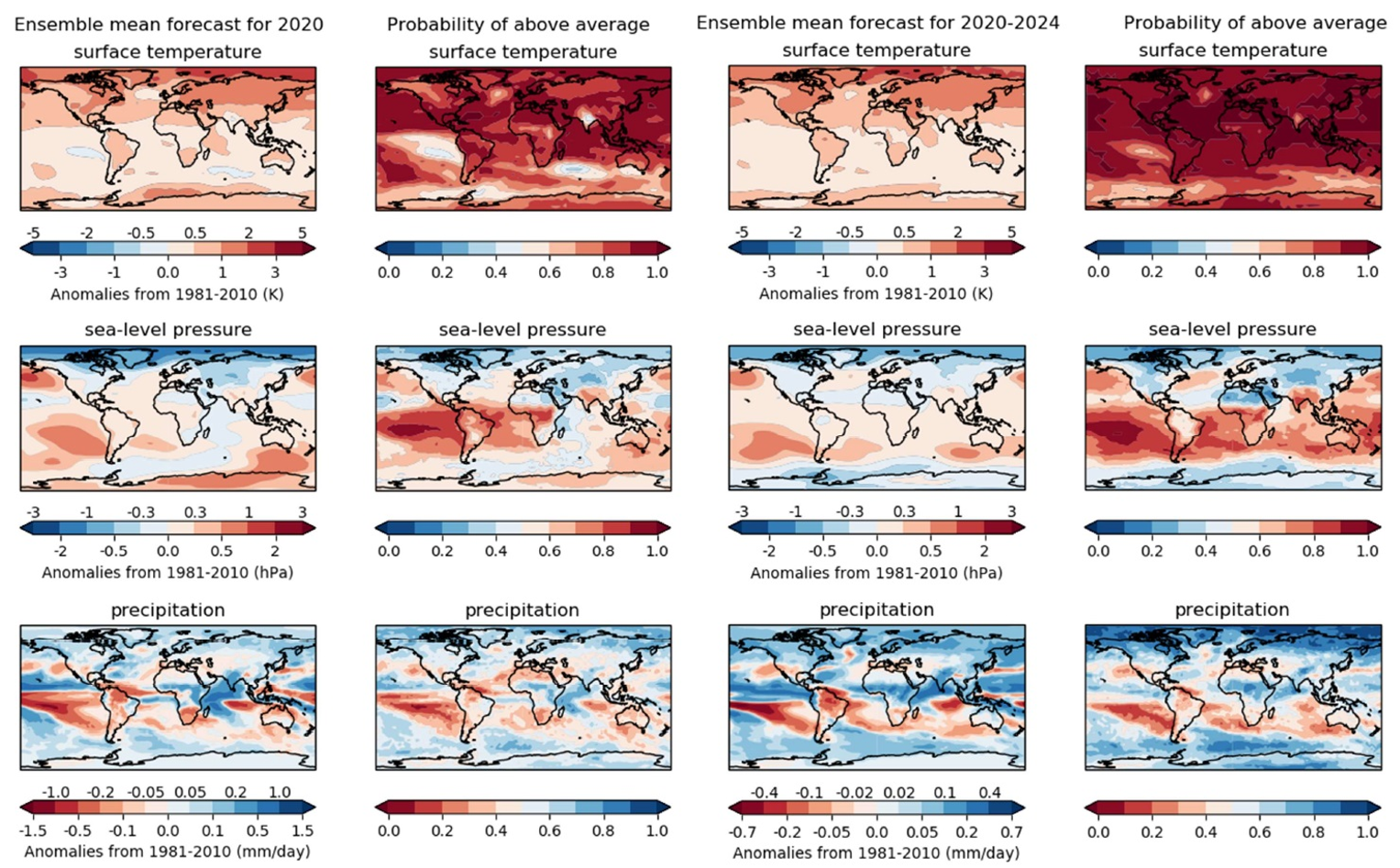 Obr. 1: (a; vľavo) Modelové predpovede priemernej ročnej odchýlky teploty vzduchu [K] (surface temperature), atmosférického tlaku na hladine mora [hPa] (sea-level pressure) a úhrnu atmosférických zrážok [mm] (precipitation) na rok 2020 v porovnaní s dlhodobým priemerom 1981 - 2010. Priemer súboru (ľavý stĺpec) a pravdepodobnosť výskytu nadpriemerných hodnôt (pravý stĺpec); (b; vpravo) modelové predpovede odchýlky teploty vzduchu [K] (surface temperature), atmosférického tlaku na hladine mora [hPa] (sea-level pressure) a úhrnu atmosférických zrážok [mm] (precipitation) v období 2020 - 2024 v porovnaní s rokmi 1981 - 2010. Priemer súboru (ľavý stĺpec) a pravdepodobnosť výskytu nadpriemerných hodnôt (pravý stĺpec) [Zdroj: WMO, Met Office].