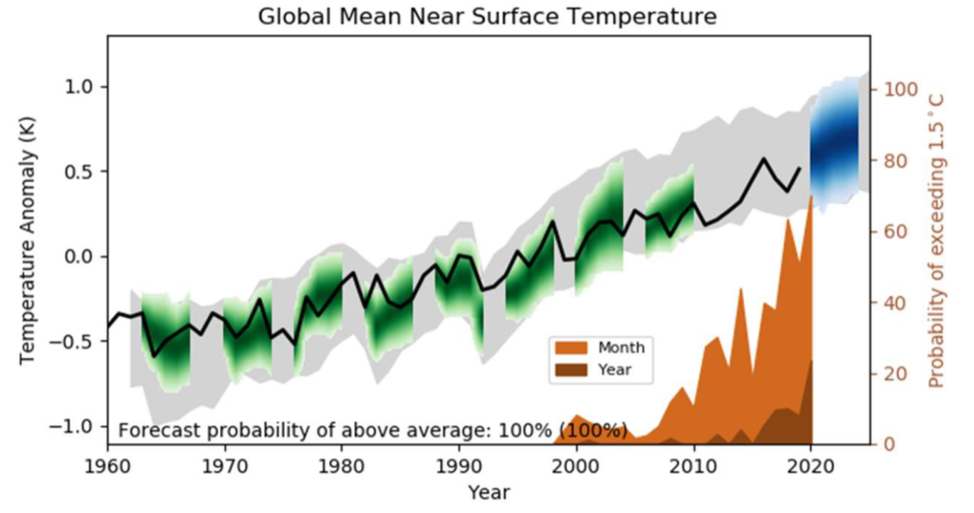 - existuje približne 70 % pravdepodobnosť, že jeden alebo viac mesiacov bude počas nasledujúcich 5 rokov najmenej o 1,5 °C teplejší ako v predindustriálnom období,